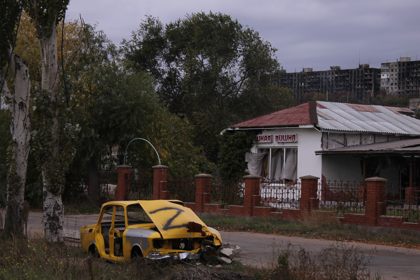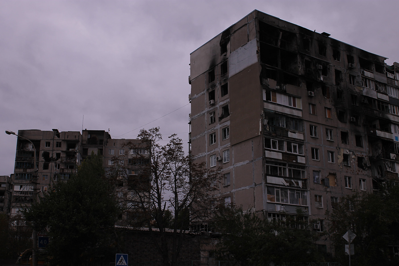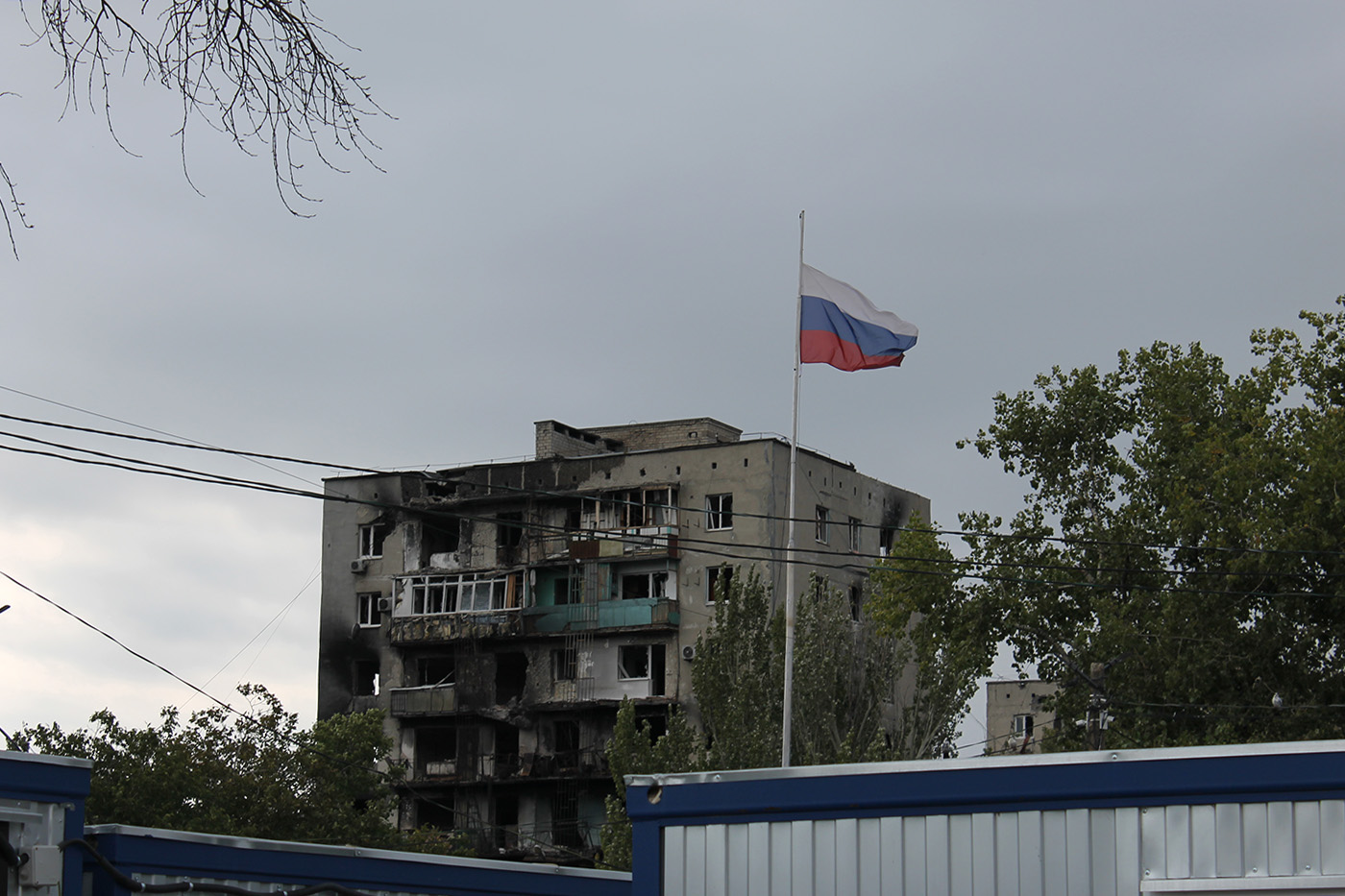 Несмотря на все происходящее, в городе все равно есть жизнь, и в некоторых окнах горит свет. Не знаю, сколько людей осталось в городе, но создается впечатление, будто ты попал в альтернативную реальность: здесь разрушенный дом, здесь военные с автоматами, а здесь дети на велосипедах катаются. На фоне сгоревшей многоэтажки развевается флаг России.