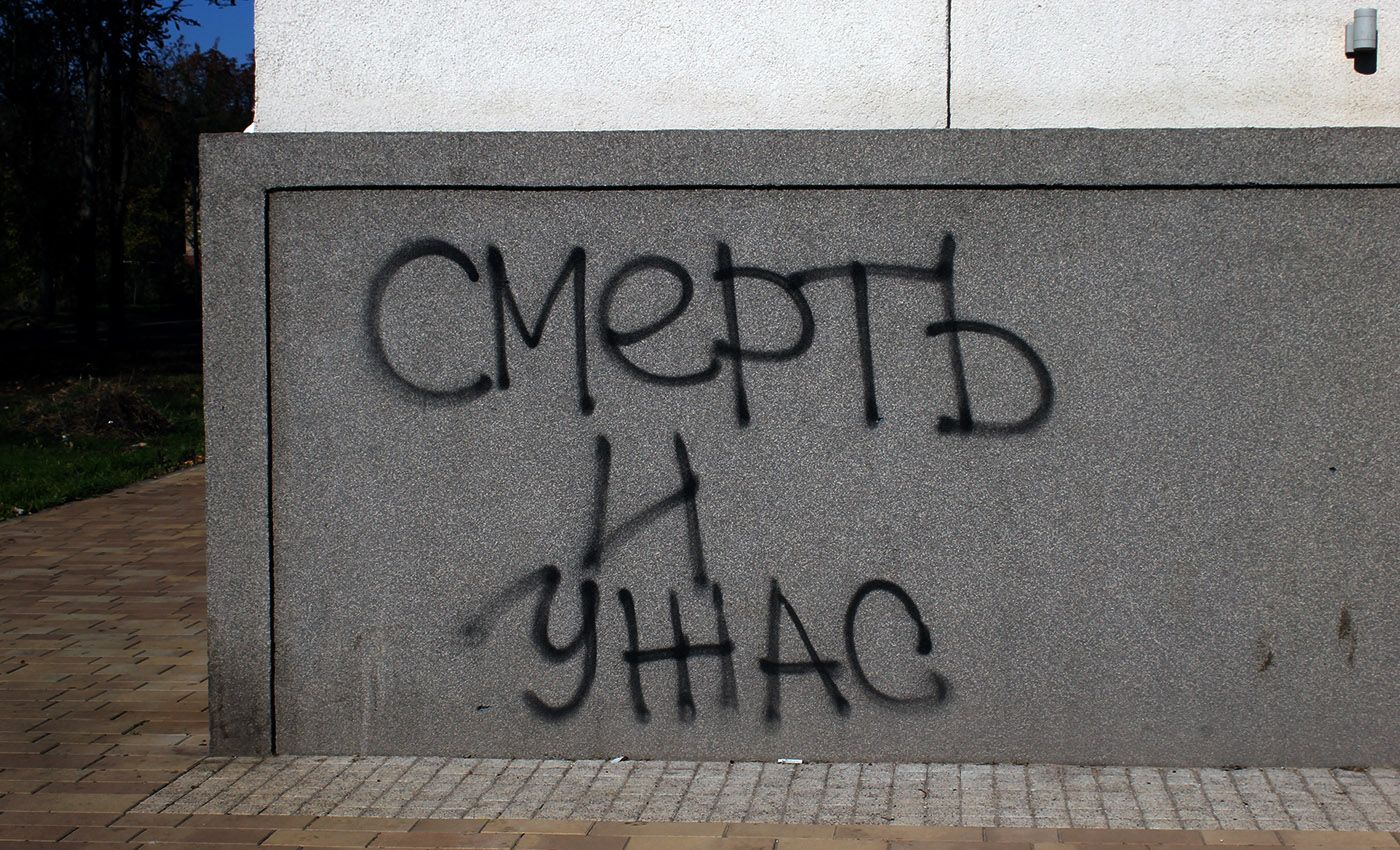 По бокам на домах часто видно надписи: «Люди», «Дети». Мне запомнилось одно граффити на здании, там было написано: «Смерть и ужас». Емко описывает настроение в городе.