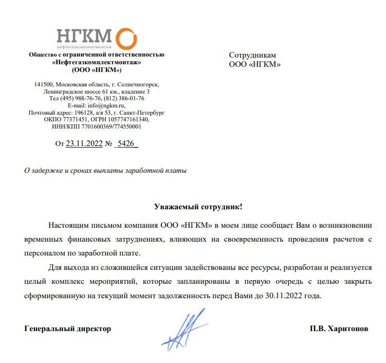 В ООО "Нефтегазкомплектмонтаж" (НГКМ) задержки с выплатами объясняют финансовыми трудностями, поэтому все расчеты "будут произведены до 30 ноября 2022 года". На документе от имени гендиректора Павла Харитонова, распространенном среди сотрудников НГКМ, есть дата и номер. Но люди считают документ липовым, "потому что у гендиректора не такая подпись, даже у его замов такой подписи нет".