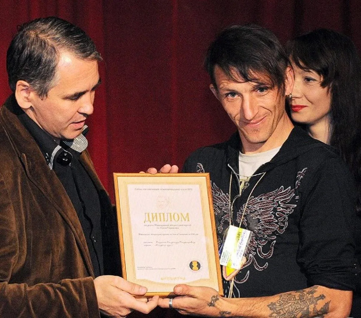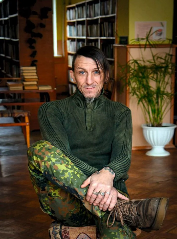 Резкое худое лицо, челка, черный прикид, кожаные штаны, татухи. В пятьдесят, да в провинции Харьковской области — пощечина общественному вкусу. Резкие суждения в диапазоне «Украина или смерть». Активный участник революции Достоинства на Майдане, был ранен «титушками».