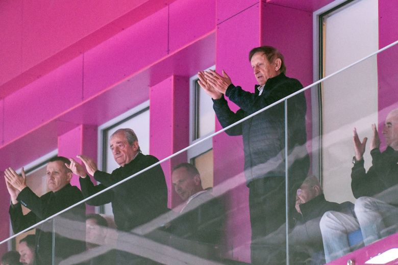 Президент АО «Мотор Сич» Вячеслав Богуслаев (справа) во время матча Лиги чемпионов между хоккейными командами «Мотор» и «Телеком Веспрем» во Дворце спорта «Юность», Запорожье, 17 ноября 2021 года