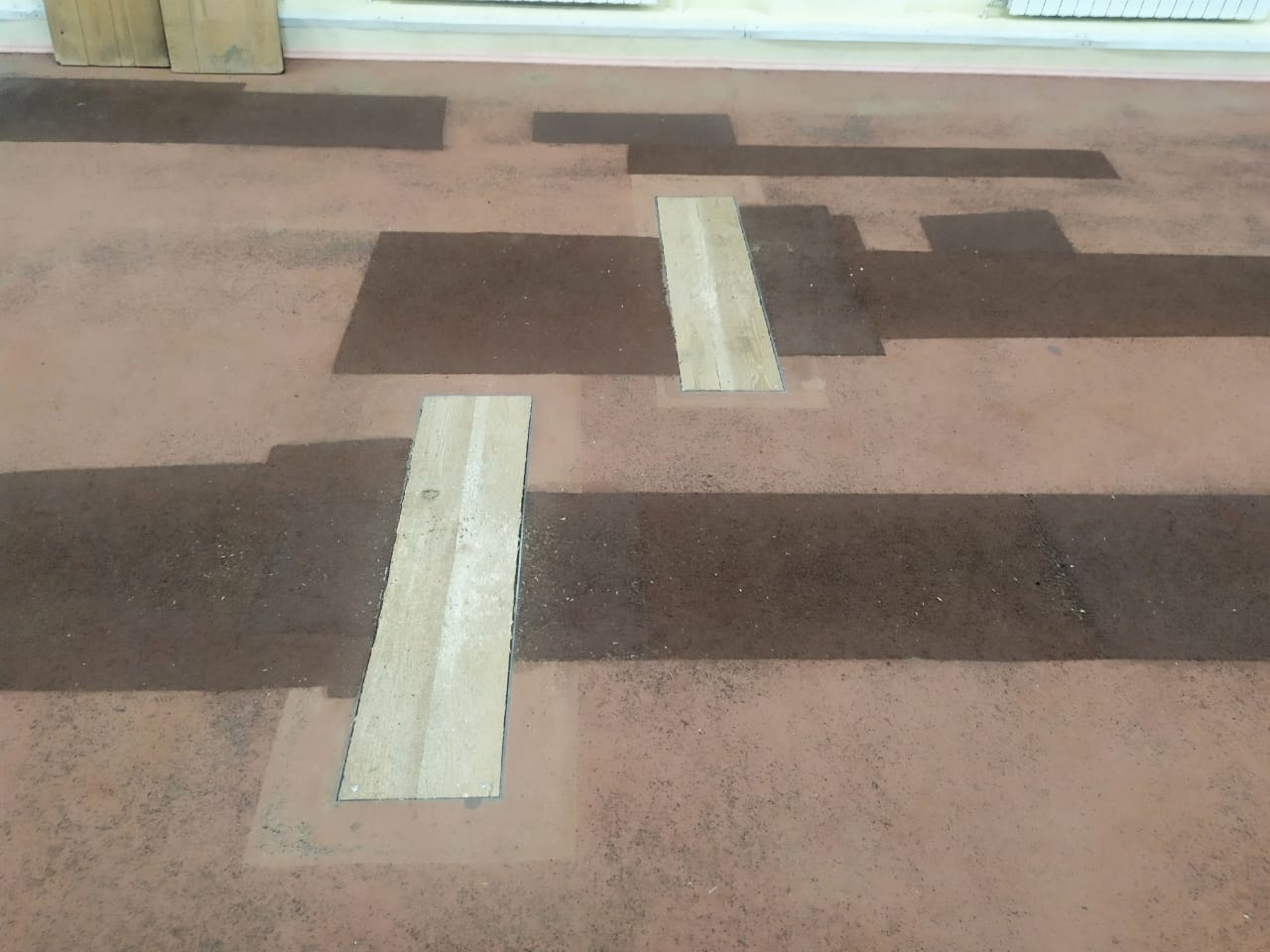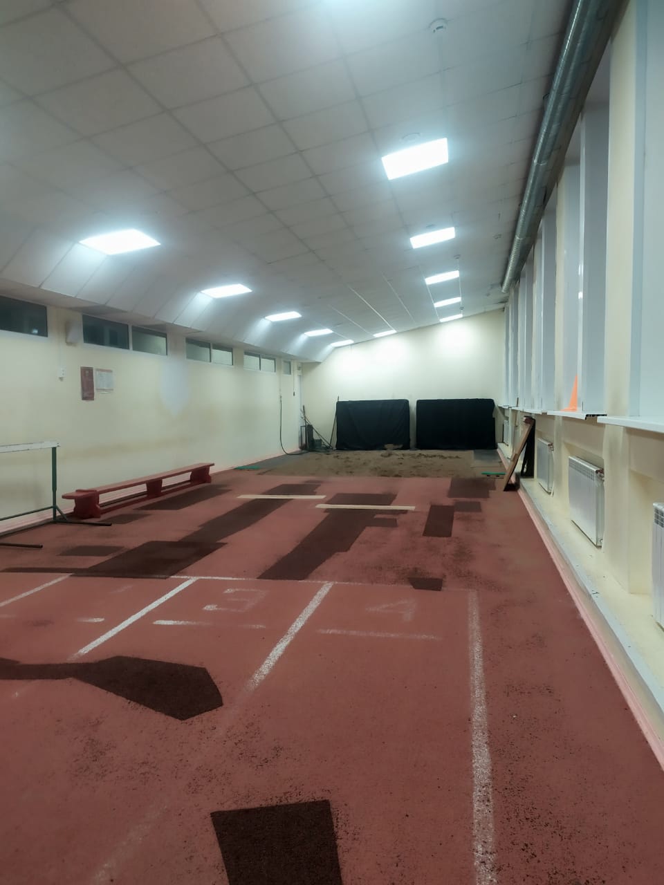 Резиновое покрытие представляет собой лоскутное одеяло, краска со стен постоянно отваливается, планка перед ямой с пеком продавливается пальцем, и посередине сучок, в раздевалках во время оттепели - потоп.