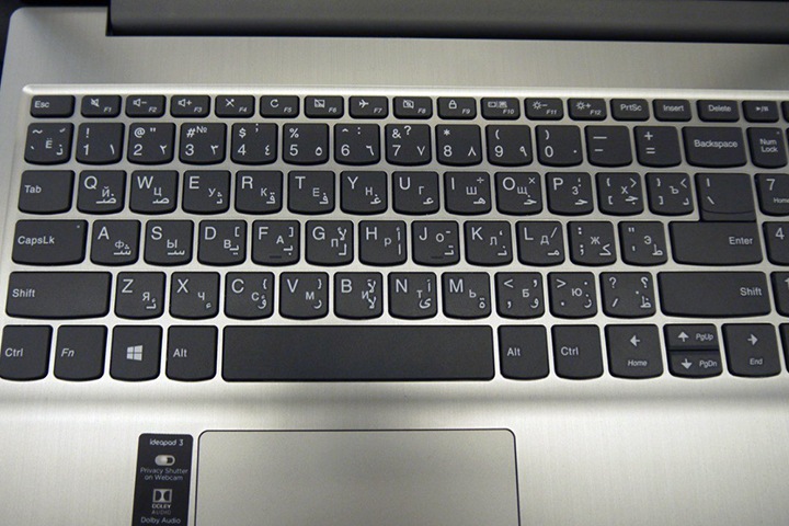 Русские буквы добавлены на клавиатуру мелким шрифтом между английскими и арабскими.