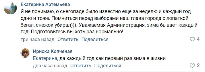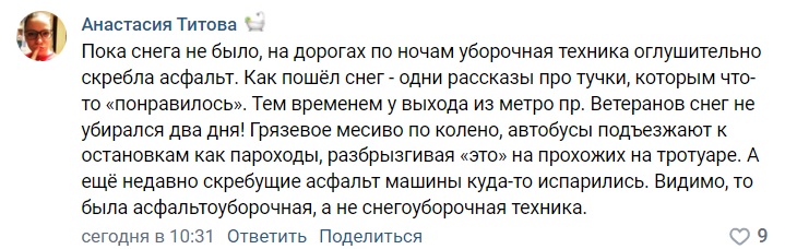 В комментариях под записями комбалага во «ВКонтакте» петербуржцы возмущаются, что власти ежегодно не справляются с уборкой. Горожанка Анастасия Титова, например, рассказывает, что выход со станции «Проспект Ветеранов» два дня не очищали от снега.