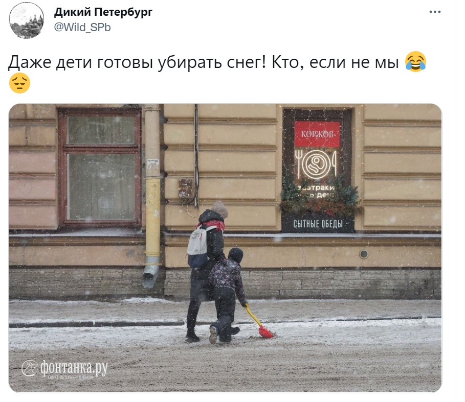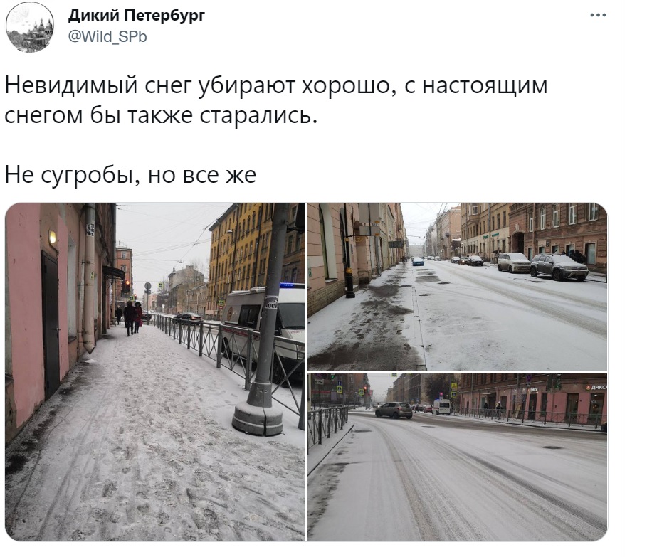 В твиттере аккаунт «Безумный Петербург» публикует мемы про очередные проблемы со снегом в городе. Там пишут, что улицы уже начали убирать дети, а коммунальщики умеют бороться только с невидимым снегом.