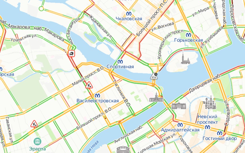 Впервые за зиму 8-балльные пробки образовались утром в понедельник, 5 декабря, писала «Фонтанка». К среде в городе сохраняются 7-балльные заторы на дорогах, показывают «Яндекс Пробки». Хуже всего ситуация в Центральном, Красногвардейском, Красносельском и Невском районах, а также в Шушарах.