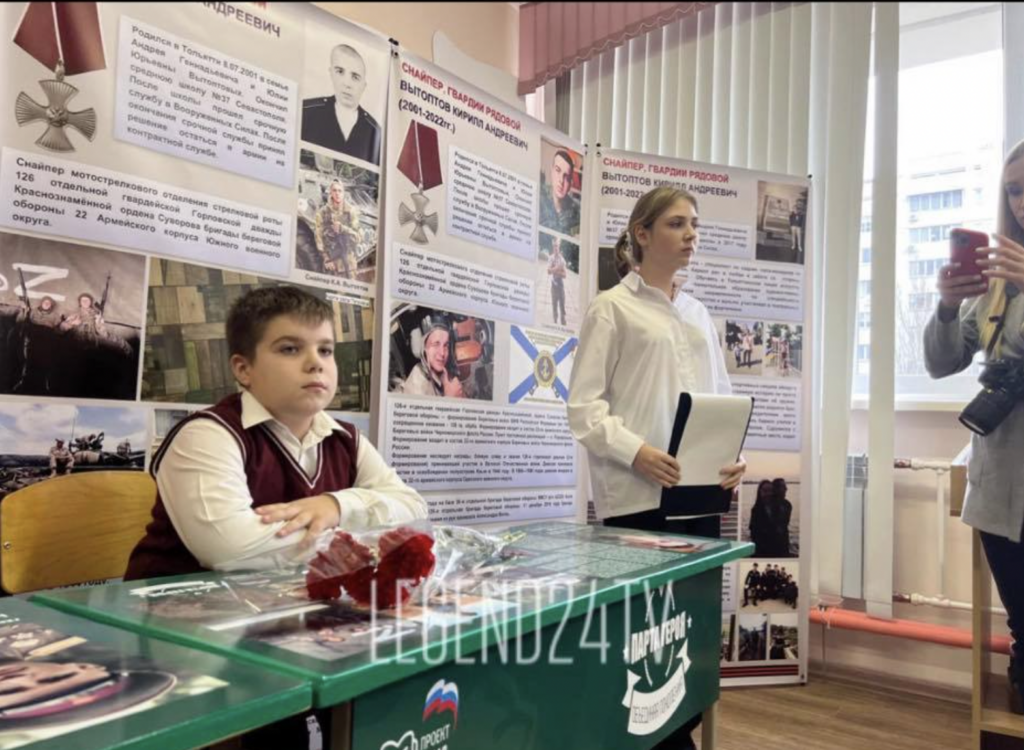 Ранее на партах размещали информацию о погибших солдатах Второй мировой войны. Теперь - погибших в войне с Украиной. За партами должны сидеть лучшие ученики.