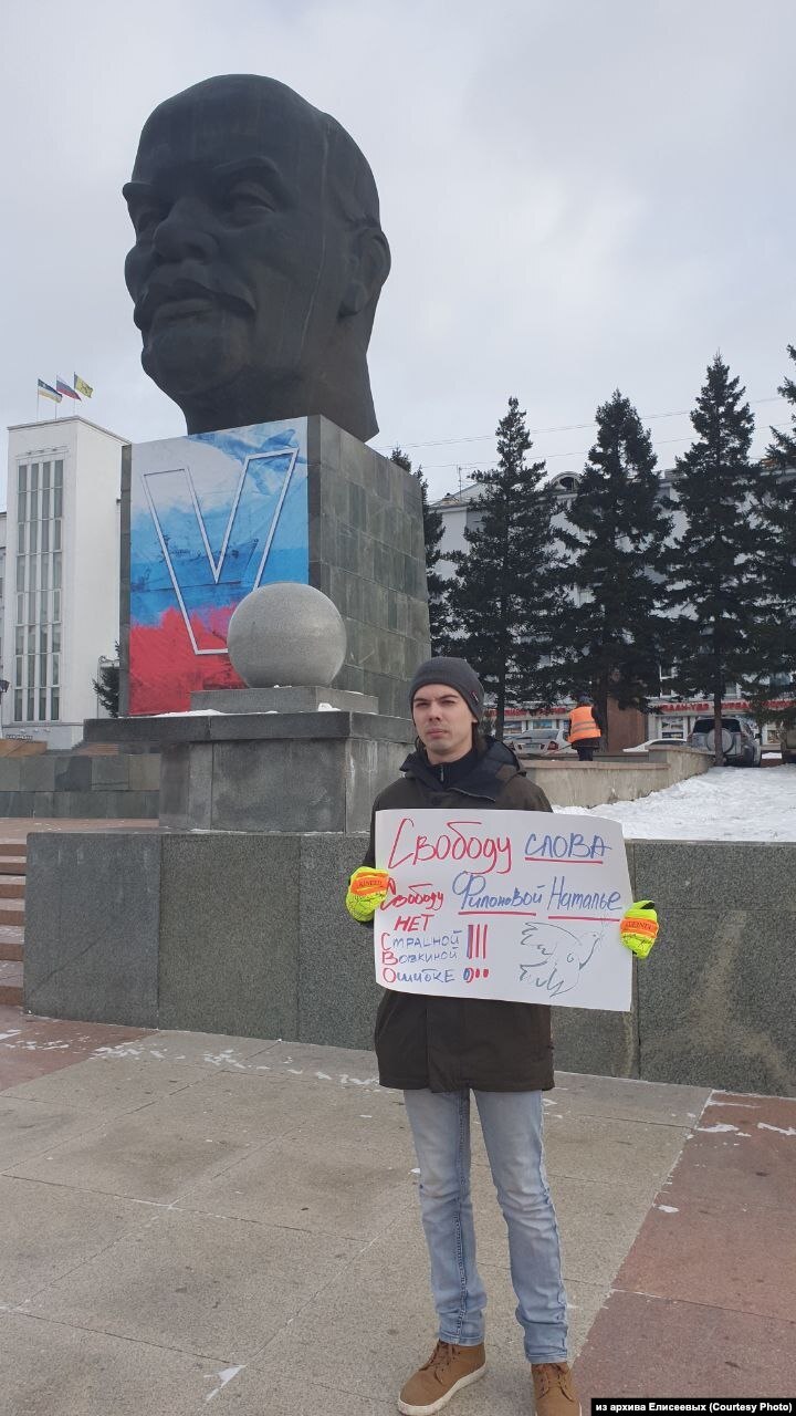 Житель Иркутска Илья Елисеев приехал в соседнюю Бурятию повидать родных и вышел в центре Улан-Удэ на одиночный пикет с плакатом "Свободу слова, Свободу Филоновой Наталье, НЕТ Страшной Вовкиной Ошибке!". Простояв 20 минут, он свернул плакат и зашел в кафе, где его ждала жена Александра. Там обоих задержали полицейские и увезли в отдел.
