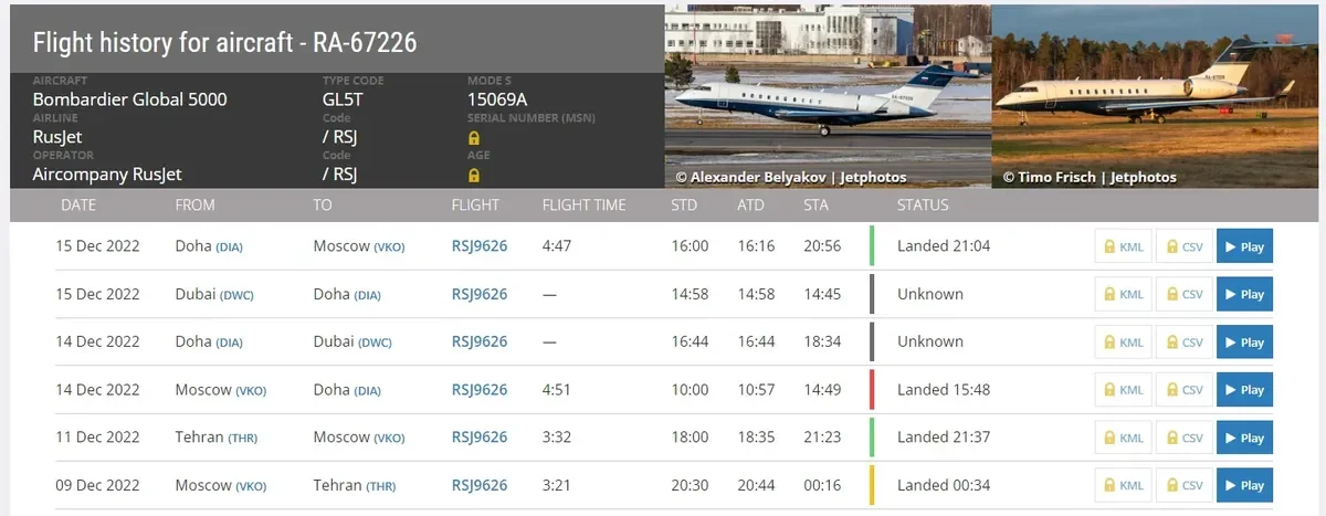 A private plane of former Russian President and current Deputy Chair of the Security Council Dmitry Medvedev landed in Doha on 14 December, the same day the second semifinal of the FIFA World Cup was played, Flightradar24 data shows.