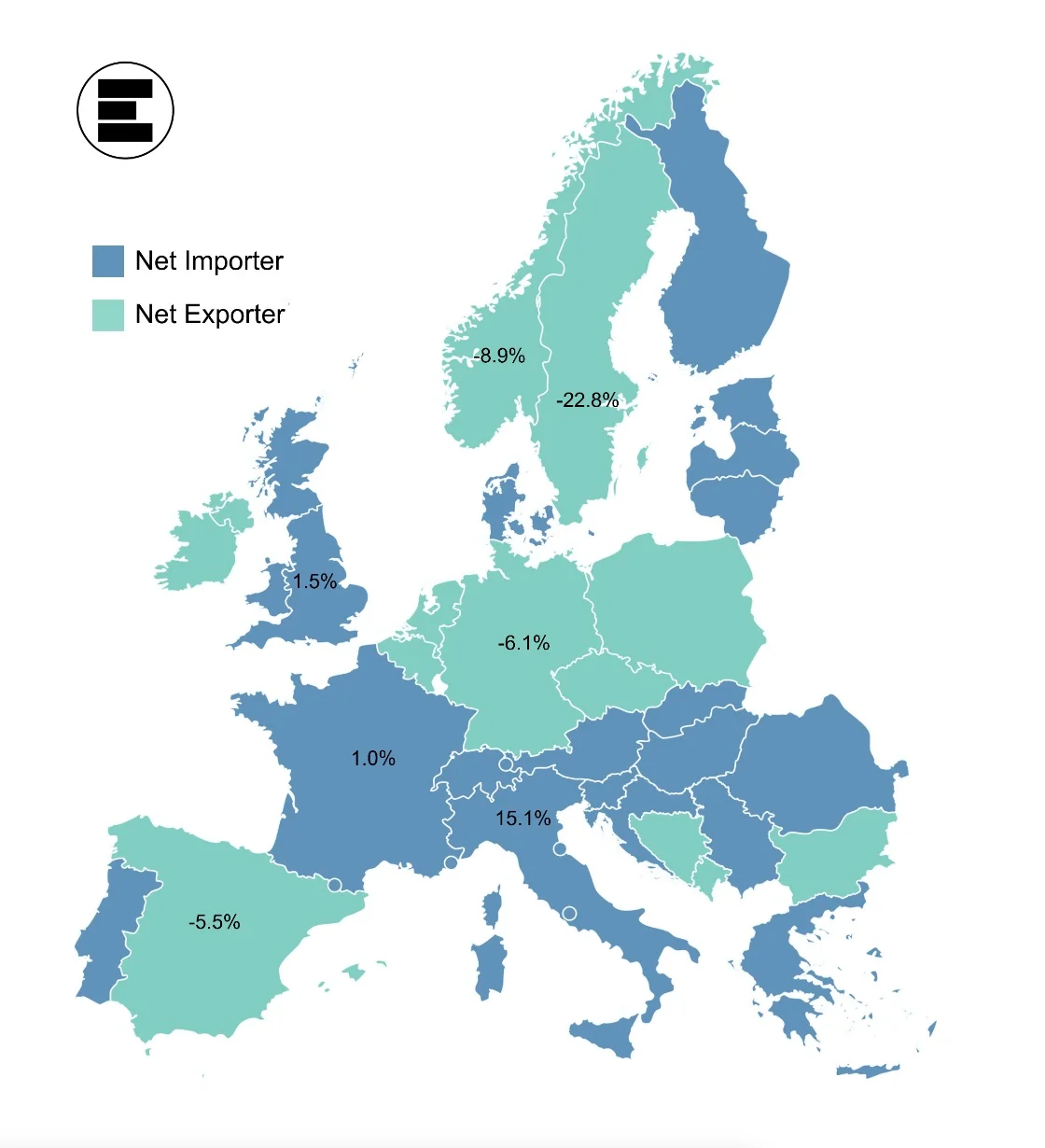 За первую половину 2022 года Франция экспортировала в два раза меньше электричества по сравнению в прошлым годом и вообще закупила больше энергии, чем продала. Эксперты опасаются, что в ближайшие месяцы страна не сможет обеспечить даже саму себя: французское правительство уже предупреждает население о беспрецедентных мерах по энергосбережению и импортирует значительные объемы электроэнергии у Германии, Испании и Великобритании, которые и сами испытывают проблемы с энергоресурсами.