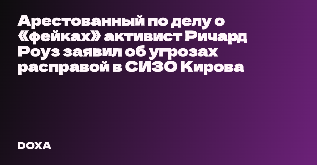 Арестованный по обвинениям в распространении «фейков» о российских военных и «оправдании терроризма» активист Ричард Роуз заявил об угрозой физической расправой в СИЗО № 1 Кирова. Об этом сообщают «Idel.Реалии» со ссылкой на письмо активиста друзьям, которое есть в распоряжении издания.
