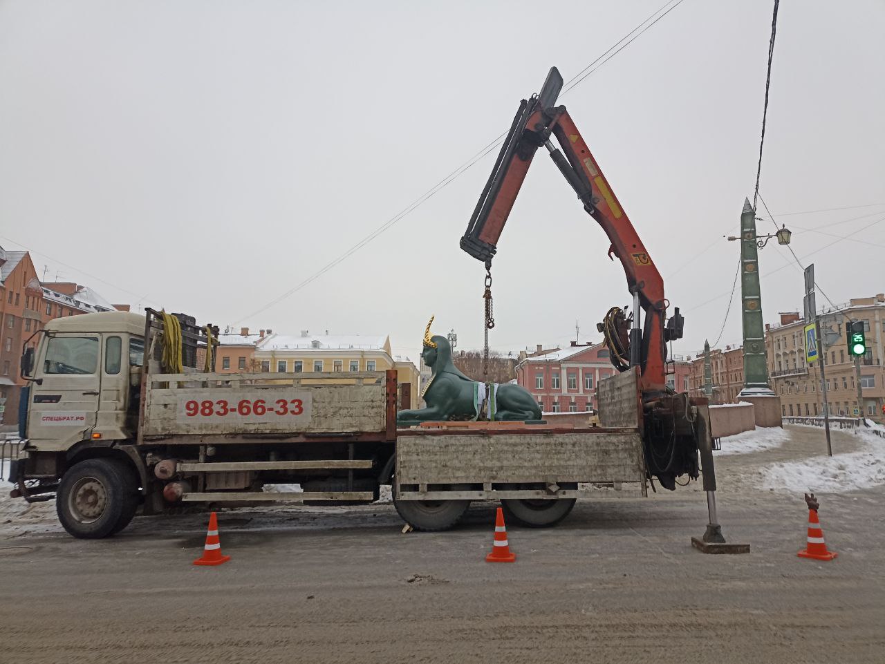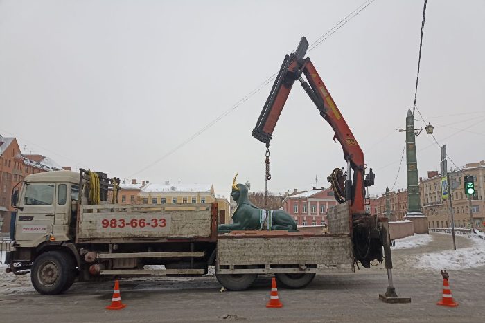 Скульптуры сфинксов после трехмесячной реставрации вернули на постаменты у Египетского моста в Петербурге, пишут очевидцы в чате сообщества «Добрососедство Коломны».