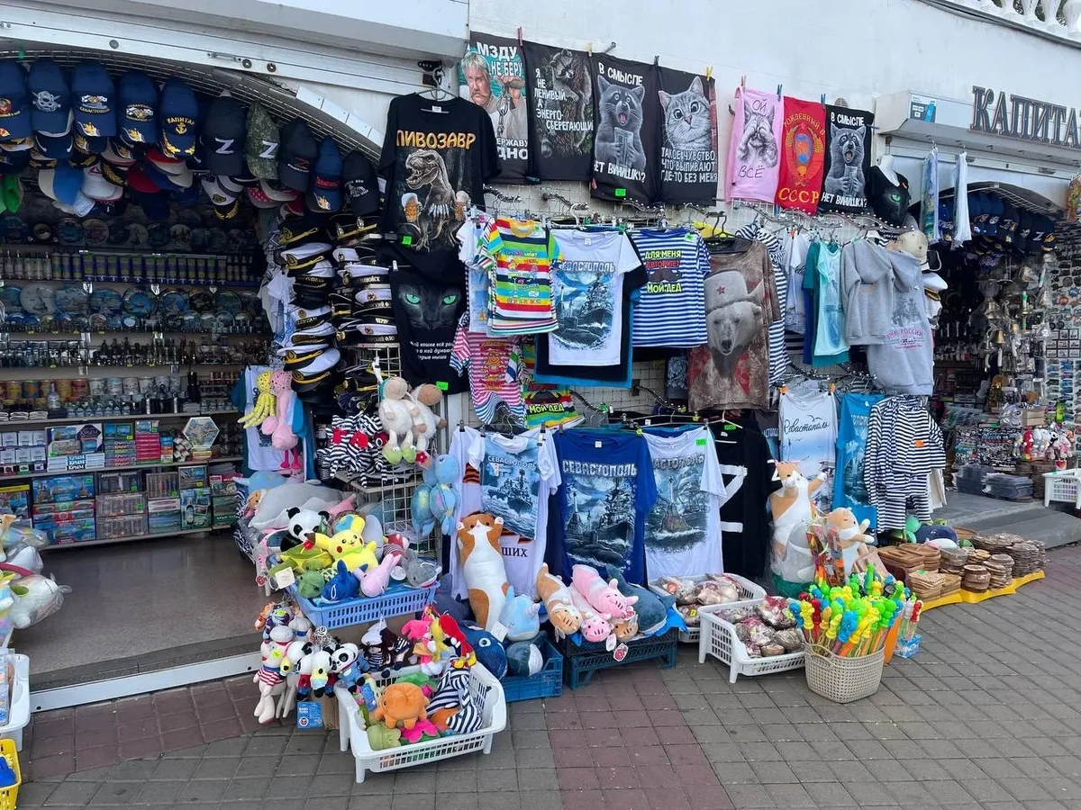 В военторге словно сосредоточились почти все ура-патриотические футболки, которые пропали из сувенирных магазинов на набережной Севастополя: тут и Путин с оголенным торсом, и Шойгу, и медведи, и Z.