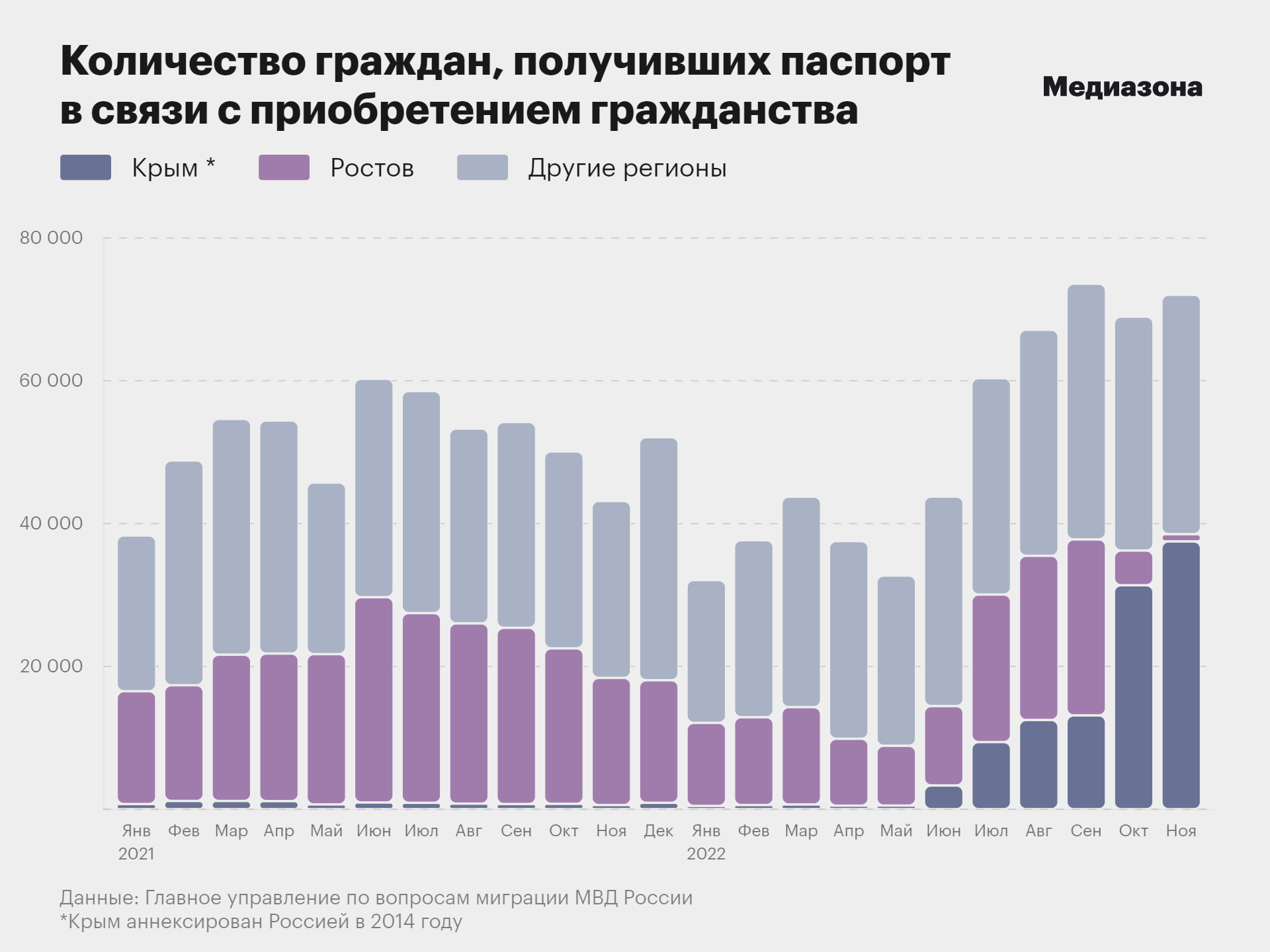 В октябре — первом месяце после аннексии — органы МВД выдали 44 тысячи таких паспортов.