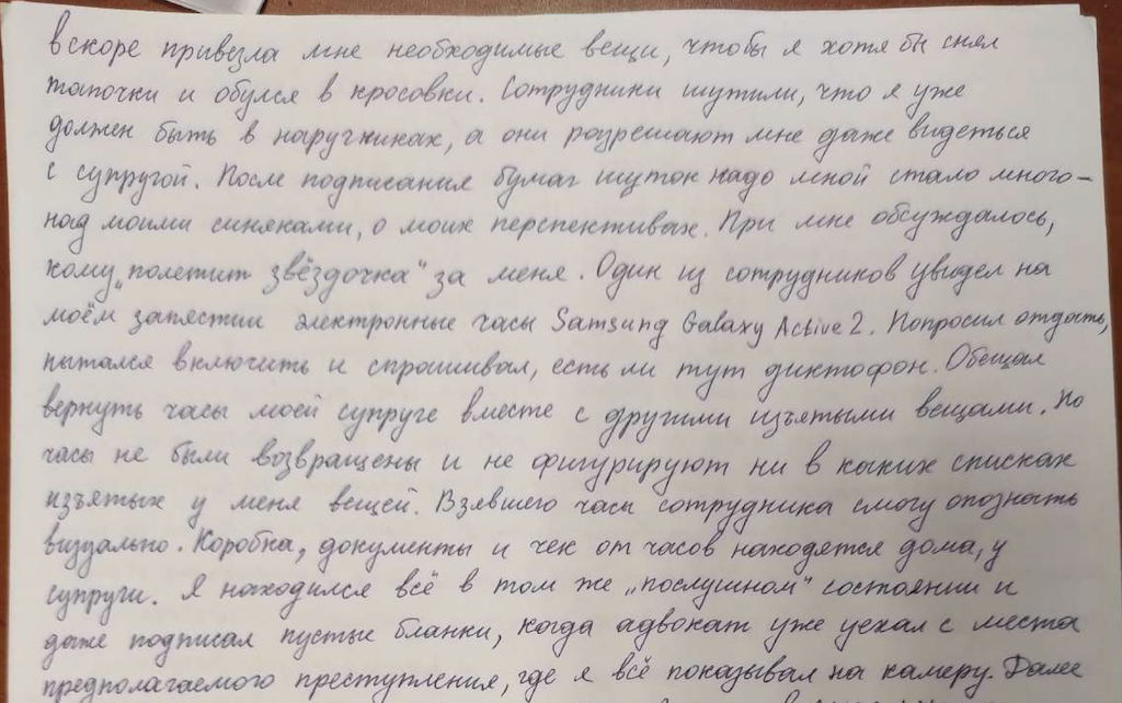 Копия письма Михаила из заключения Специалист подчеркнул, что, попав в руки полицейских, которые начали его бить, Михаил стал говорить то, что от него требовали. На это заключение судья тоже не обратил внимания и приобщить его к делу отказался.