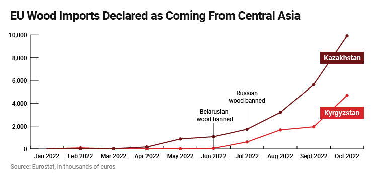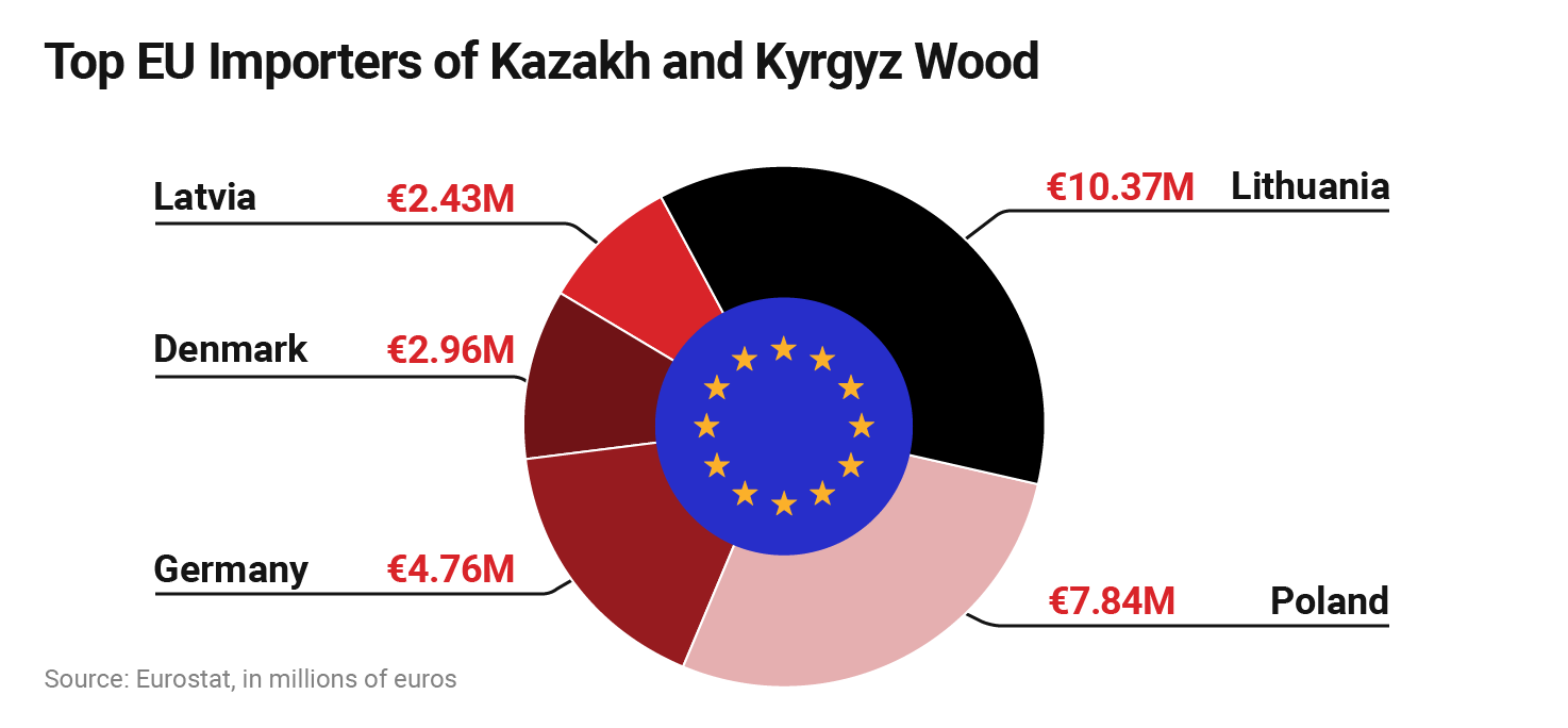 Согласно данным европейской торговли, большинство древесины, якобы поступавшей из Казахстана и Кыргызстана, отправлялось в Литву, Польшу, Германию, Латвию и Данию. С июня по октябрь 93% древесины, которая поступала в ЕС якобы из Казахстана и Кыргызстана, шли в эти пять стран.
