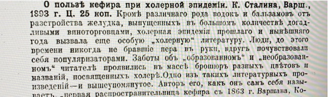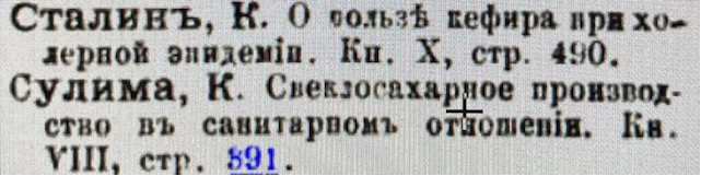 Впервые имя «К. Сталин» (именно в этой форме оно было использовано И. В. Джугашвили в 1912 году) появилось в журнале «Русская беседа» 1893 года в результате опечатки в рецензии на книгу о пользе грузинского кефира от всех болезней, написанной тифлисской еврейкой, популяризаторкой кисломолочных продуктов и членом французской академии Клаудией Абрамовной Сигалиной («О пользе кефира при холерной эпидемии. К. Сталина. Варшава, 1893 г.»; в азбучном указателе к тому приводится имя «К. Сталинъ»).