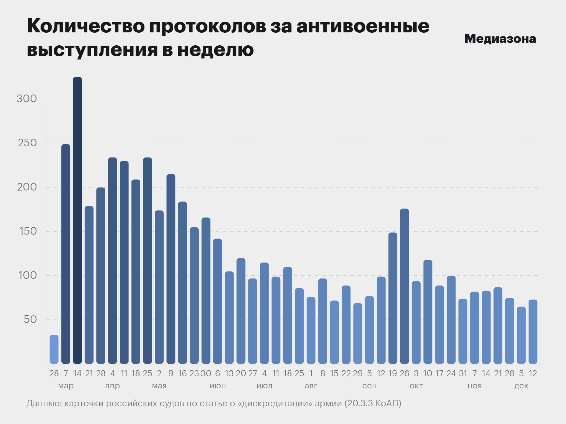 С начала марта 2022 года в суды России поступило 5 518 административных дел о «дискредитации» армии (20.3.3 КоАП). Это следует из данных системы ГАС «Правосудие», которые собрала «Медиазона».