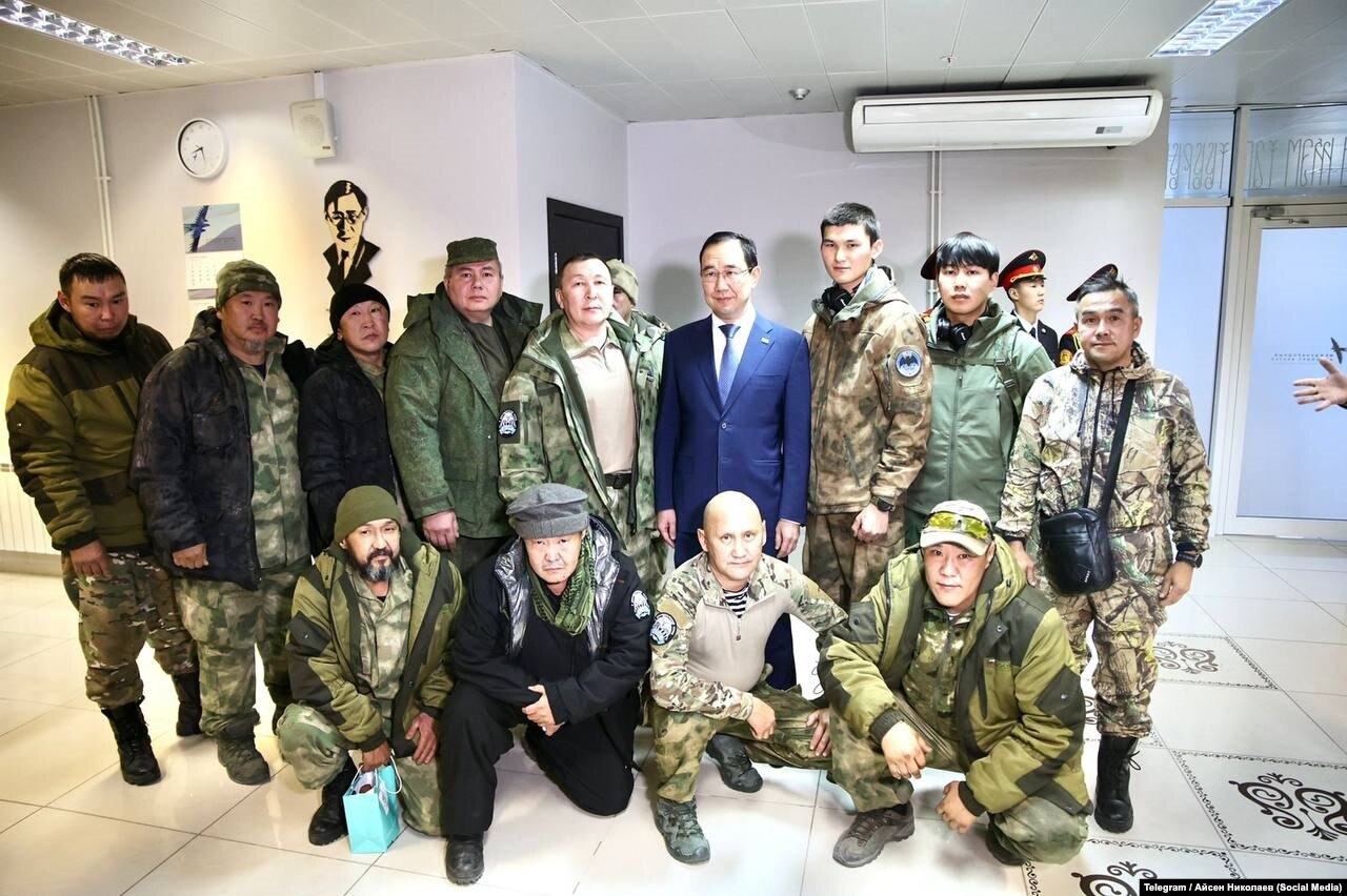 Через месяц первый набор "Боотура" – судя по фото, около 80 человек – отправился в Украину. Провожать добровольцев пришел лично глава Якутии Айсен Николаев. Через три месяца домой вернулось всего 13 человек. При этом, по словам Николаева, потери батальона составили всего восемь человек.