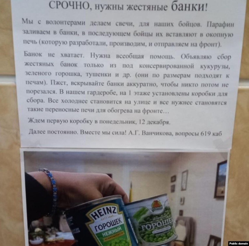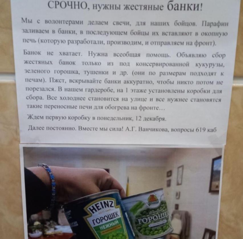 Банок не хватает. Нужна всеобщая помощь. Объявляю сбор жестяных банок только из-под консервированной кукурузы, зеленого горошка, тушенки и др. (они по размерам подходят к печам). Вскрывайте банки аккуратно, чтобы никто потом не порезался. В нашем гардеробе, на 1 этаже установлены коробки для сбора. Все холоднее становится на улице и все нужнее становятся такие переносные печи для обогрева на фронте", - написано в объявлении в здании краевой администрации.