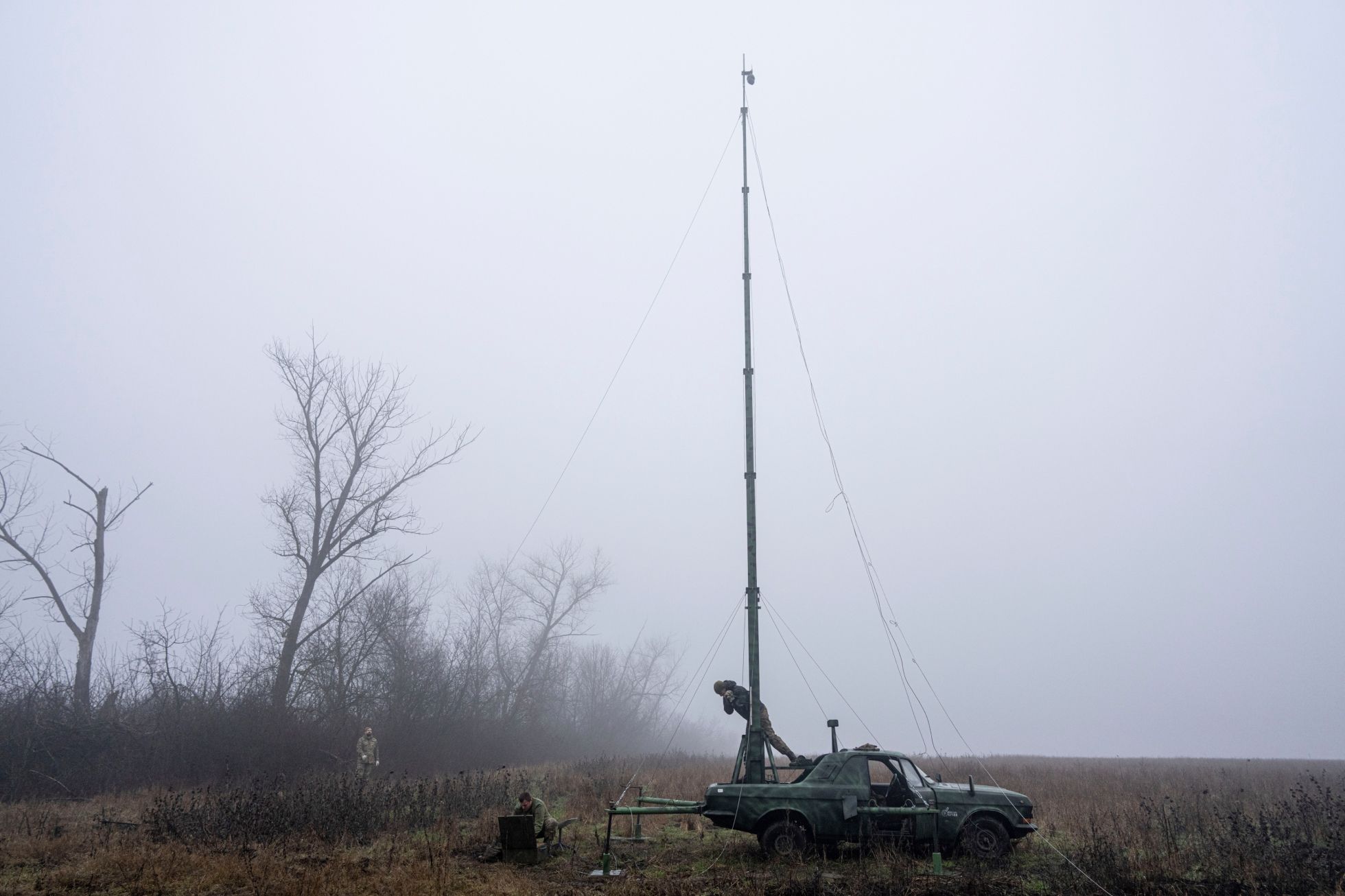 Военнослужащие 127-й бригады ВСУ устанавливают камеру на телескопическую вышку, оборудованную на старой советской «Волге» для наблюдения и корректировки огня на линии фронта.