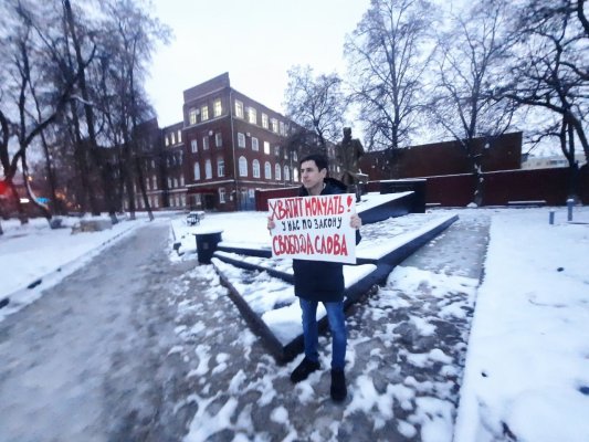 В Воронеже задержали активиста, который вышел в одиночный пикет в защиту свободы слова. На плакате у активиста был текст: «Хватит молчать! У нас по закону свобода слова». В настоящий момент он уже отпущен на свободу. Об этом сообщает телеграм-канал «Ворнадзор Против Войны и Мобилизации».