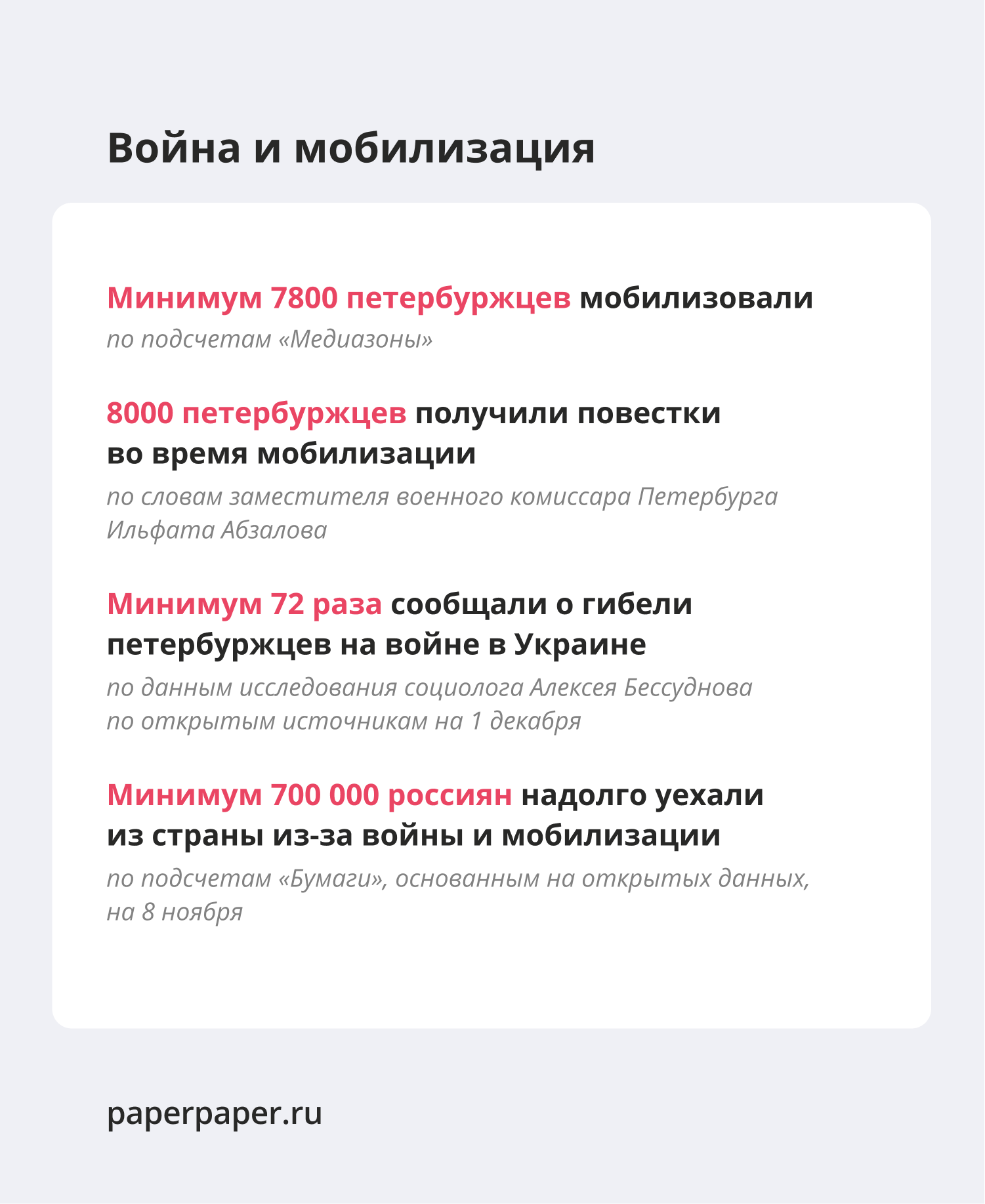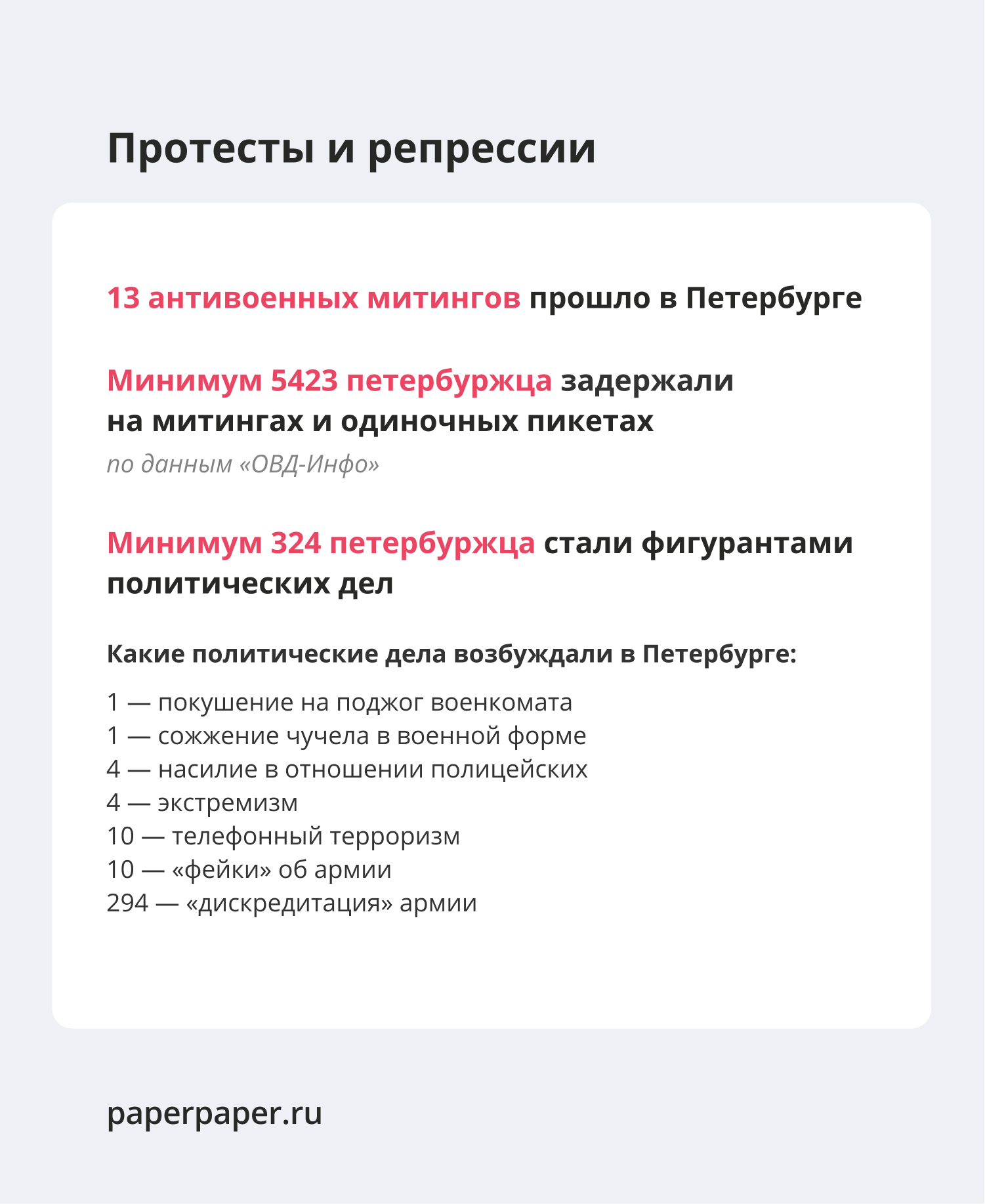 «Бумага» собрала итоги 2022 года для Петербурга и России. Показываем на карточках, сколько человек задержали на антивоенных акциях, сколько мобилизационных повесток разослали петербуржцам, о чьей гибели на войне стало известно, а также как много компаний прекратили работу.
