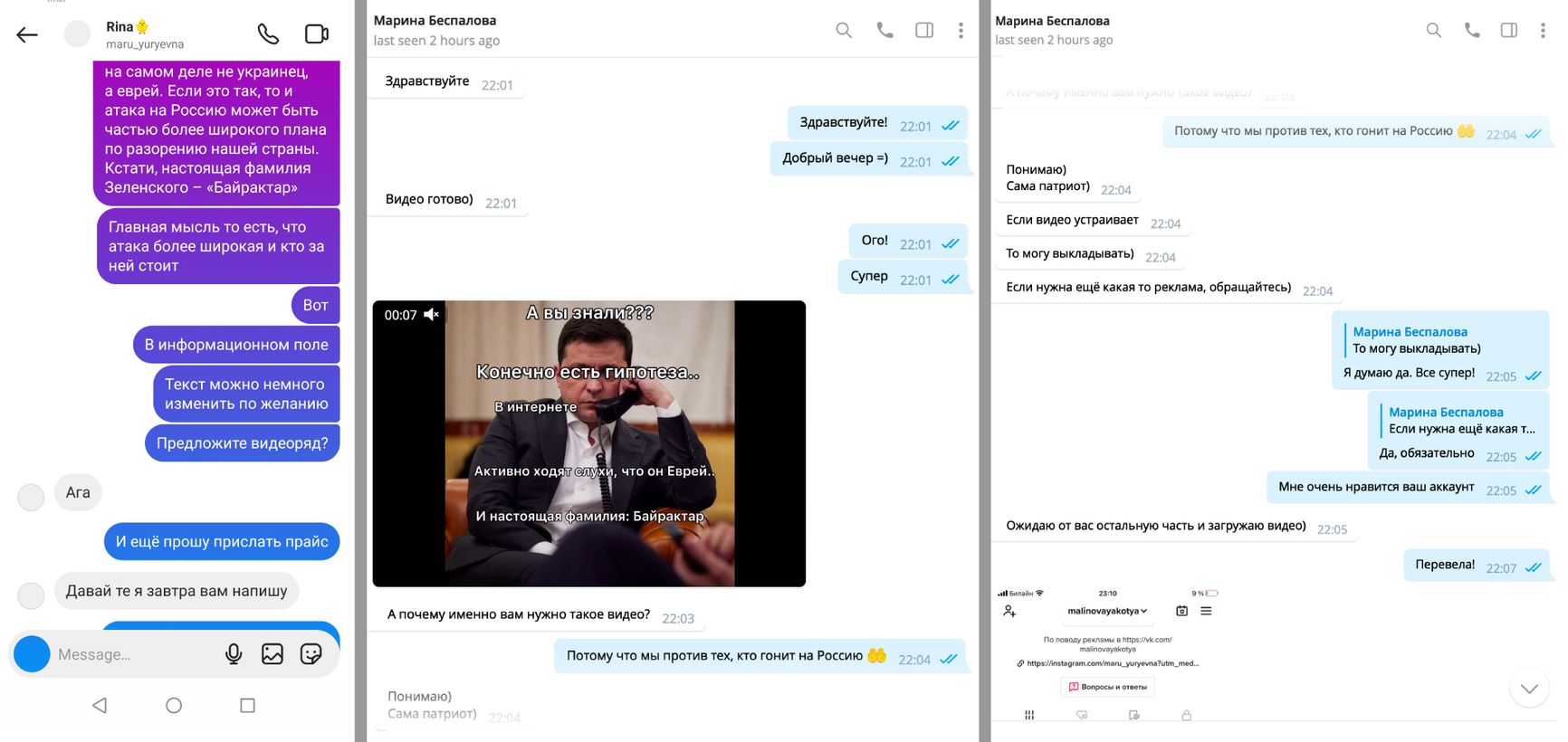 Экспериментировал The Insider и с еще более нелепыми техническими заданиями. Одним из них было — выложить видео с «сенсационной» идеей о том, что президент Украины Владимир Зеленский «на самом деле еврей», а его настоящая фамилия — Байрактар. Этот ролик согласилось сделать несколько тиктокеров, например, Марина Беспалова, которая и раньше публиковала ролики о Зеленском. Вопросом о содержании видео она задалась только после выполнения задачи.