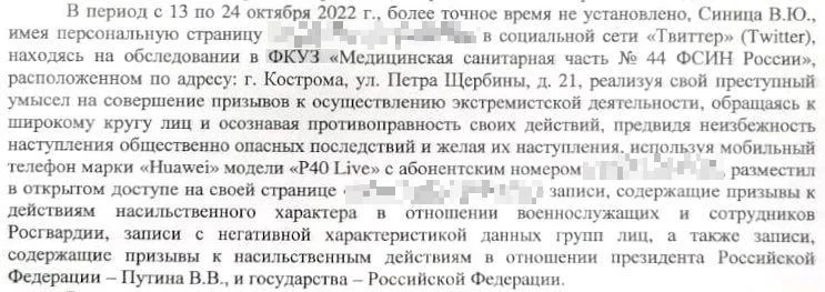 Правозащитный проект отмечает, что твиттер-аккаунт, фигурирующий в материалах дела, зарегистрирован в октябре 2022 года. Первый твит в нем размещен 13 октября — это цитата того самого твита о «детях нацгвардейцев», за который Синицу приговорили к пятилетнему сроку в 2019 году.