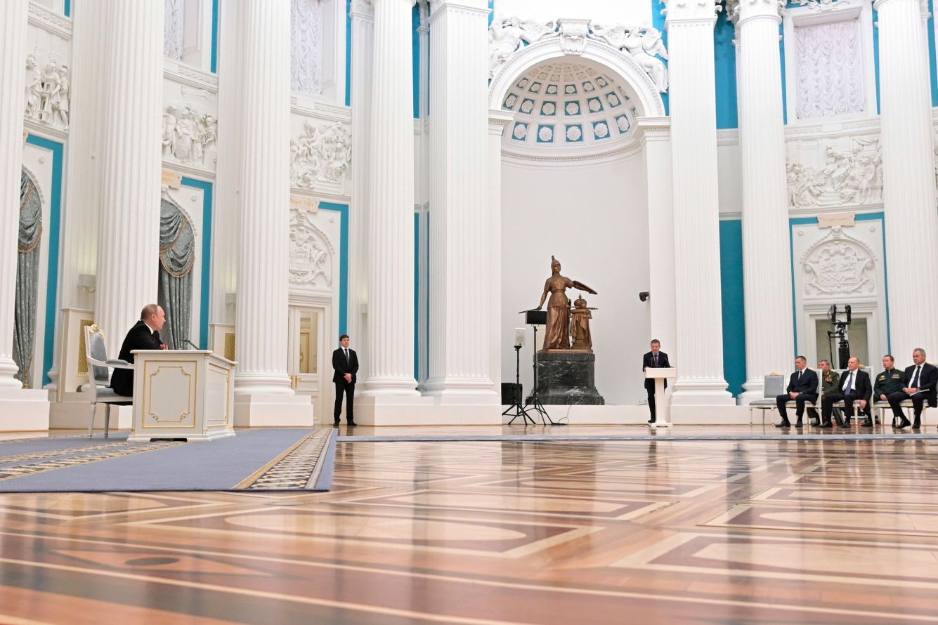 Дмитрий Азаров / Коммерсант / Sipa USA Церемония в честь аннексии украинских регионов. В первом ряду — пресс-секретарь президента Дмитрий Песков, заместители главы АП Владимир Островенко, Магомедсалам Магомедов и Сергей Кириенко, первый вице-премьер Андрей Белоусов, секретарь Совбеза Николай Патрушев и заместитель главы Совбеза Дмитрий Медведев