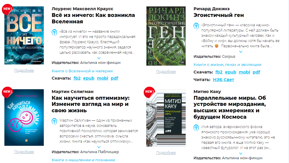 Книги, ставшие бесплатными в 2022-м, отмечены знаком New. Можно скачать разом весь архив или только архив с новыми книгами. Можно также скачать архивы по одной из четырех тем: книги о вселенной и материи, книги о жизни, генах и эволюции, книги о мышлении и познании, книги о человеке и обществе.