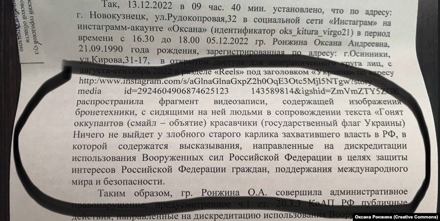 32-летняя Оксана Ронжина живет в маленьком шахтерском городке Осинники в Кузбассе. Недавно за опубликованную в инстаграме фразу "Гонят оккупантов, красавчики. Ничего не выйдет у злобного старого карлика, захватившего власть в РФ" ее обвинили в "дискредитации" российской армии. Эта фраза и украинский флаг сопровождали короткое видео, запечатлевшее людей на бронетехнике.