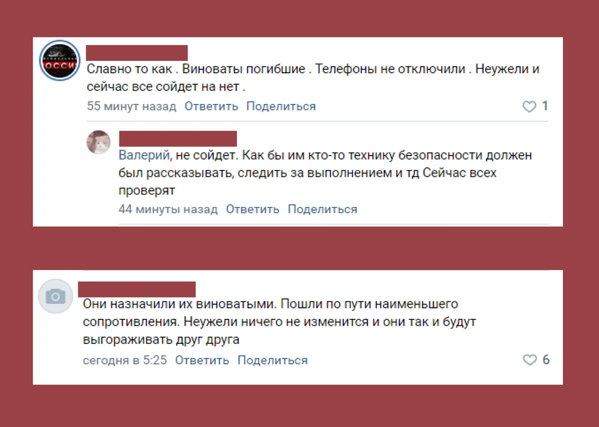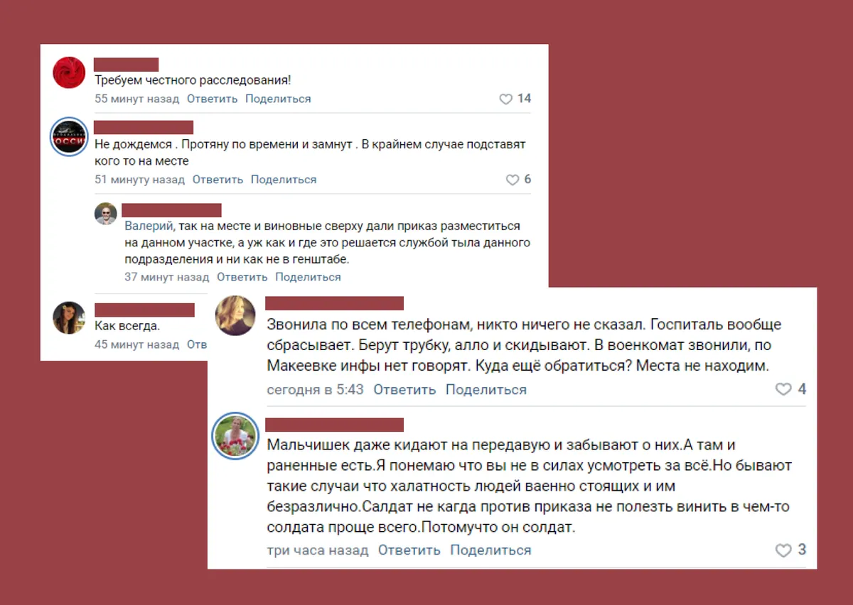 Многих родственников погибших возмутило заявление Минобороны. По крайней мере, об этом говорят их многочисленные критические комментарии в группе во «Вконтакте». У многих выживших солдат после удара начались конфликты с руководством. «Некоторые ребята писали, что их начинают гнобить, говорят, что признают дезертирами за то, что они растеряли свое оружие, разбежались кто куда. Но в тот момент, когда начали бомбить, понятное дело, что там многие из окон выпрыгивали кто в чем был, им было не до того, чтобы бежать искать, где у них там оружие стоит», — говорит волонтерка.