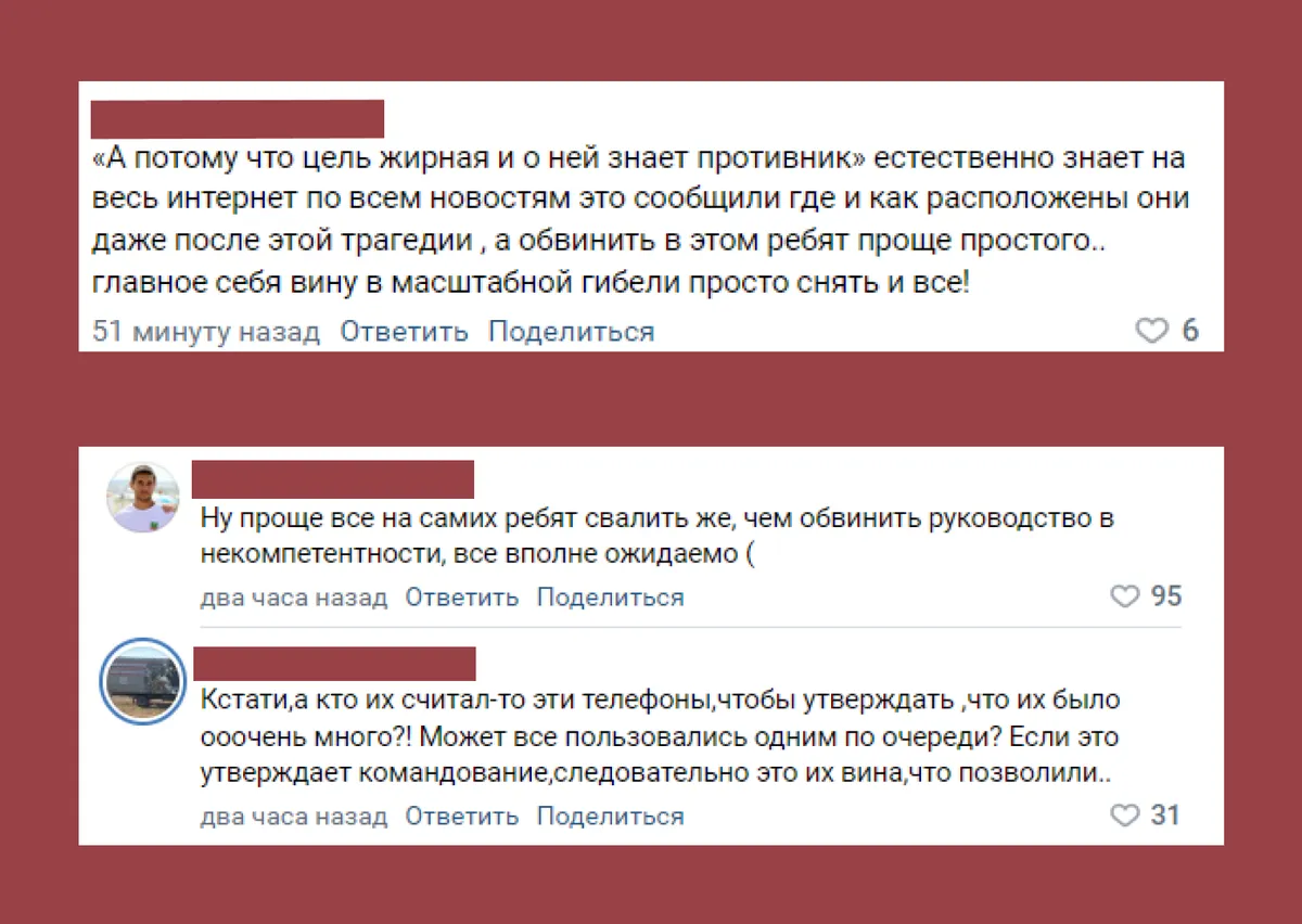 «Причем здесь телефоны, почему хотят спихнуть и рассказать, что это телефон виноват? Наверное, каждый высокопоставленный чиновник хочет свои грехи так замолить за счет обвинения других, — рассказала «Важным историям» российская волонтерка, которая общается с родственниками погибших. — Ребята не пользуются там нашими симками. Там ловит связь “Феникс”. Через нее раздавался wi-fi на всех, об этом командиры знали. Значит, они позволяли это делать. Значит, понимали, что это не ведет к каким-то последствиям»