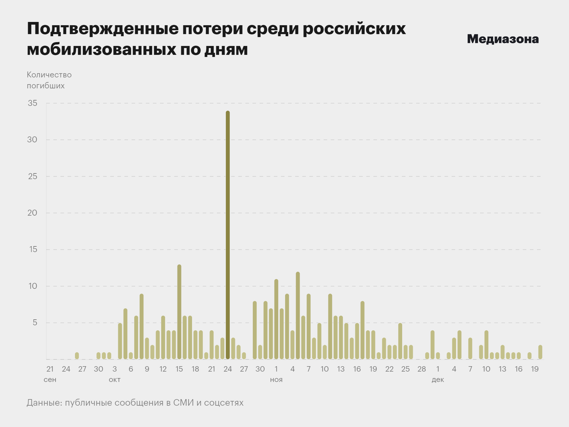 Как минимум 34 мобилизованных погибли 24 октября 2022 года, свидетельствуют подсчеты, которые «Медиазона» ведет совместно с волонтерами и русской службой «Би-би-си». На самом деле жертв в тот день могло быть гораздо больше — в открытых источниках точную дату гибели мобилизованного указывают далеко не всегда.