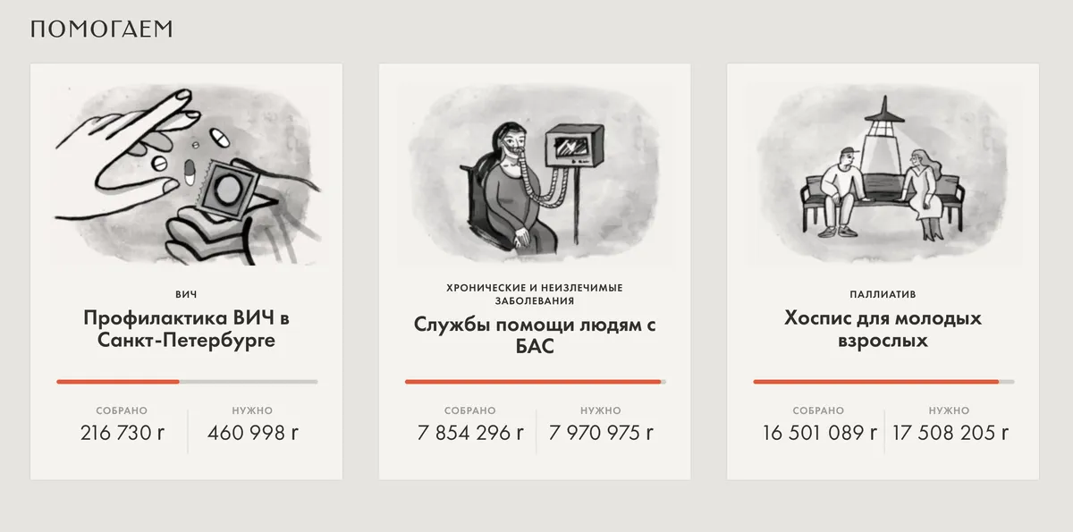— В первом и втором квартале всё было стабильно, в третьем квартале мы ужасно просели, а вот под Новый год все немножко стали возвращаться. Я слышу от некоммерческих организаций, что они тоже столкнулись с проблемой, когда количество пожертвований от бизнеса или от крупных доноров уменьшилось, — делится Софья Жукова. — На презентации исследования про структуру благотворительного меценатства, где я была, было очень интересное выступление, в рамках которого было сказано, что российский бизнес не стал давать меньше денег, но у них сменились приоритеты. Например, появился запрос от региональной власти помочь достроить детскую площадку в школе, покрасить стены в больнице и так далее. Подтвердить эти данные я никак не смогу.
