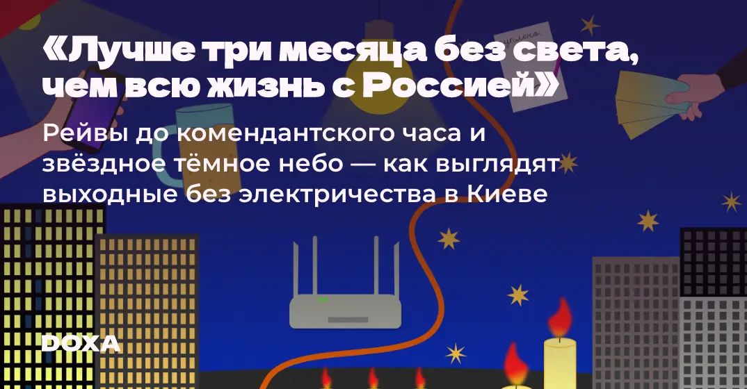 Улицы без освещения и скупленные газовые горелки — это реальность Киева во время отключений света. Уже больше месяца российские власти пытаются спровоцировать у горожан панику и отчаяние. Вместо этого после октябрьского массированного обстрела украинцы полностью приспособились к жизни без постоянного электричества. DOXA попросила журналиста из Киева описать один уикенд из жизни города — с супермаркетами в полумраке и ранними рейвами.
