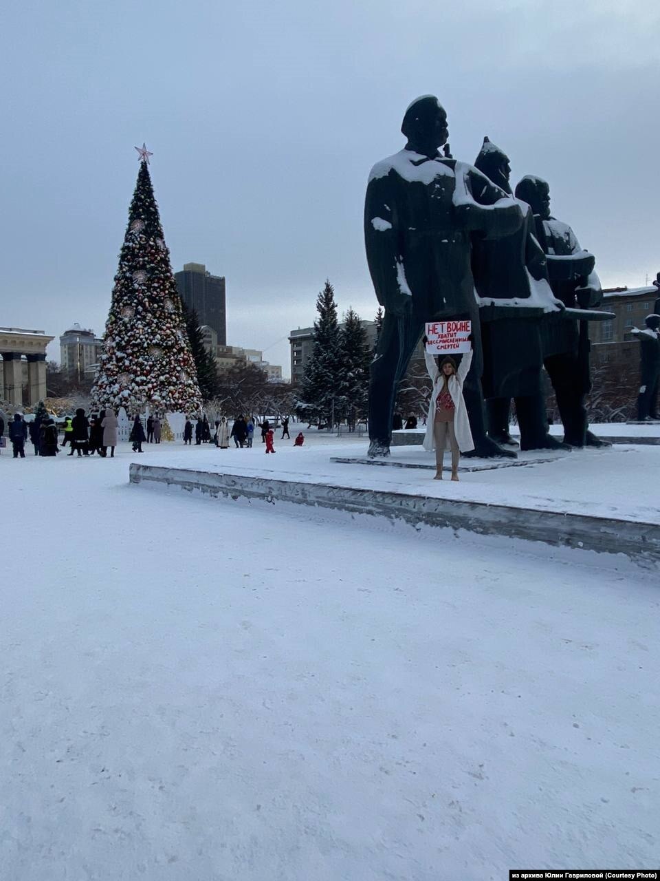 2 января Юлия Гаврилова вышла на площадь Ленина в центре Новосибирска с плакатом "Нет войне. Хватит бессмысленных смертей". Перед этим художница нарисовала "антивоенных бабочек" и расклеила их по городу. На пикете Юлию практически сразу задержали и вскоре увезли в ОВД, откуда выпустили через несколько часов с протоколом по статье 20.3.3 КоАП ("Дискредитация ВС России"). По этой статье ей грозит штраф до 50 тысяч рублей. Юлия рассчитывает, что еще до суда уедет из России.