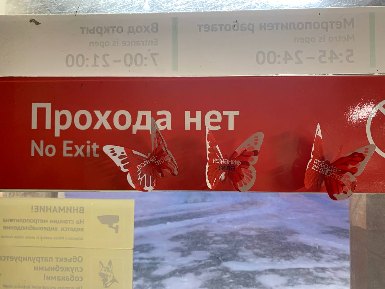 Ноябрь и декабрь я раскрашивала и вырезала бабочек с абсурдными фразами, которые иллюстрируют действие пропаганды: "Незнание – это сила", "Свобода – это рабство", "Война – это мир". Выбирала, куда буду их клеить – в городе, например, полно Z-плакатов, или надпись в метро "Прохода нет".