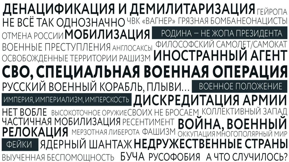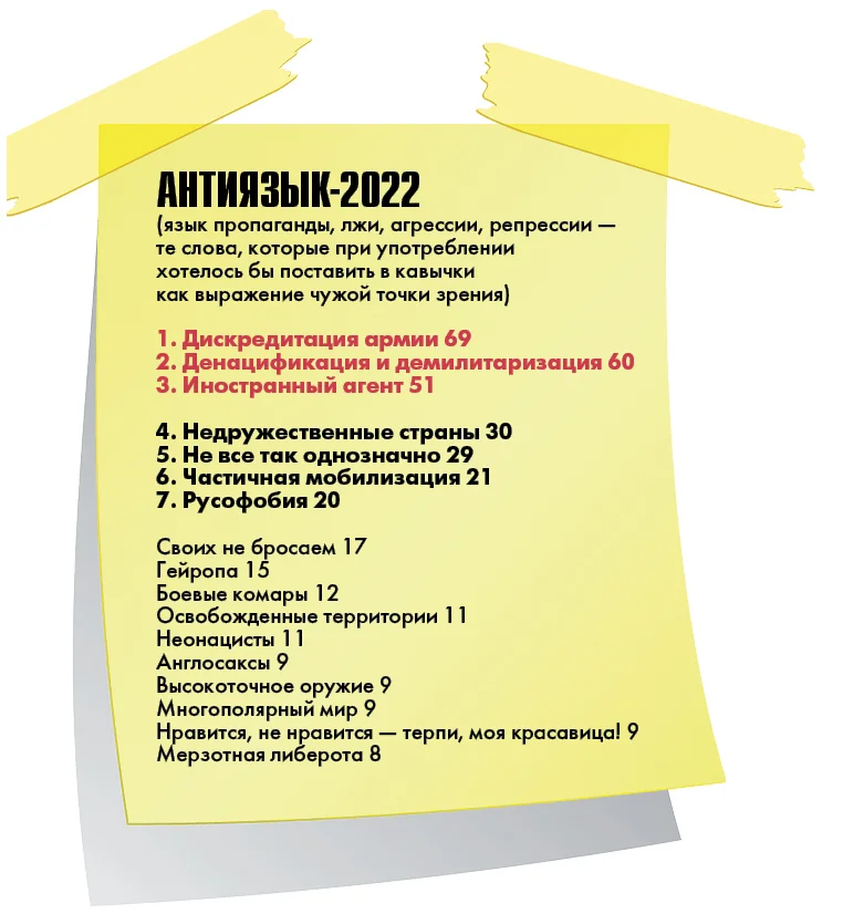 Номинация «Антиязык» года напоминает опять же о нашей корневой привычке увертываться от смысла происходящего, врать даже самим себе. И перекладывать ответственность на других. <…> Денацификация — попытка скрыться за выражением, имевшим когда-то действительный смысл — когда мы вместе с союзниками боролись против нацизма; теперь же мы, словно дети, играющие во дворе, сами назначаем, кто будет наш, а кто — фашист; и само выражение теперь лишено смысла; фиговый листок, заплатка на зияющем провале. Недружественные страны — как будто они сами, по самой своей природе такие вот нехорошие — не хотят дружить с нами; а мы-то, мы-то — всегда были открыты, всегда только с добром к ним!.. А когда уже совсем нельзя не замечать, <…> тогда мы прибегаем к крайней мере, говоря: «Не все так однозначно». И вновь-таки — с помощью этого выражения отворачиваемся от правды, всеми силами стремимся ее не признать, не называть, не смотреть ей в лицо. Самооправдание — сколько придумано слов для самооправдания. Русофобия — неужели мы не способны посмотреть на себя хоть капельку объективно, признать, что критика в наш адрес бывает справедливой. Ведь каждый народ в конце концов в своей истории совершал ошибки, иные — и преступления; неужели мы — единственные, кто никогда не ошибался? Наконец, выражение «Нравится, не нравится — терпи, моя красавица!» (Владимир Путин); западные журналисты, помнится, в начале этого года пытались его понять и перевести; к сожалению, смысл поговорки в полной мере понятен только тем, кто вырос здесь, в советских дворах и школах, впитавшим здешние правила. В подтексте тут насилие — над кем-то заведомо более слабым; но, кроме того, это еще и насилие, которое собой упивается, которое ссылается при этом на исторические закономерности, неизбежности (тебе все равно никуда не деться от этого, так уж повелось). Мерзотная либерота — как невольное признание того, что попадаются еще отщепенцы, способные смотреть на мир не через уродливые линзы пропаганды. <…>