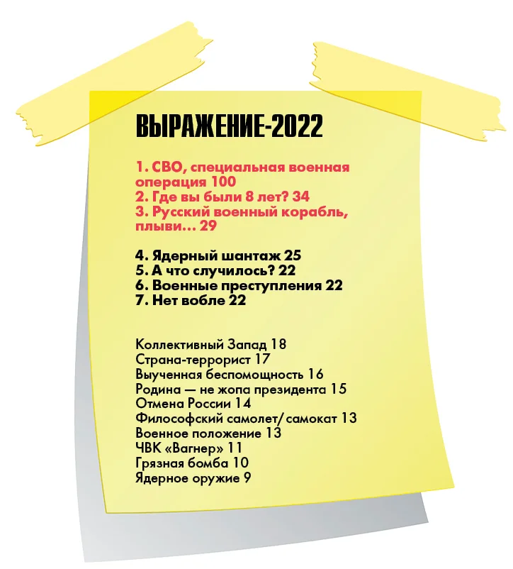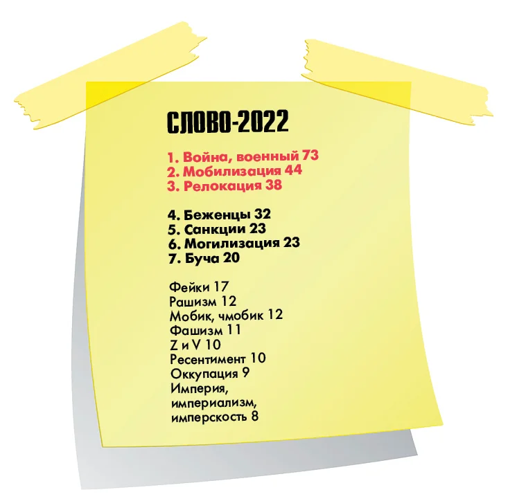 Слова года — «война», «военный»; ловишь себя на мысли, что мы слышали и произносили их всю сознательную жизнь, вслух или про себя. Слово «война» всегда присутствовало в нашей жизни — это касается прежде всего людей с советским опытом. Мы произносили его куда чаще, чем «мир». Конечно, мы делали это не со зла, так нас воспитывали. Сама русская культура, увы, тесно переплетена с войной, но война — вольно или невольно — была для нас долгие годы мерилом всего. Конечно, в эпоху перемен, в перестройку, в 1990-е годы слово как бы отступило, поблекло; казалось бы — еще чуть-чуть, и заживем как остальные народы — миром, надеждой и будущим. Но при Путине это слово опять стало вползать, влезать в мозги; за то, что мы не нашли смысла в мирной жизни, не изменили свое сознание, все мы теперь наказаны. <…> Война не может быть смыслом жизни, какой бы справедливой в прошлом она ни была — вот нам страшная наука.