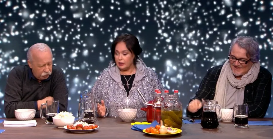Первая такая «интеллектуальная дискуссия» под завлекательным названием «После вчерашнего» собрала за накрытым для похмельного обряда столом компетентных экспертов: «чудесника» Леонида Якубовича, «миллионера» Дмитрия Диброва, всероссийскую сваху Ларису Гузееву. Последняя оказалась компетентнее своих коллег-мужчин в этой деликатной сфере. Принесла в студию бульон, сваренный из черного петуха. Почему черного? Потому что черный петух принимает на себя очень много солнца. Значит, берете черного петуха и варите его вместе с квашеной капустой 7 часов. Потом процеживаете, капусту выбрасываете — «похмелин» готов.