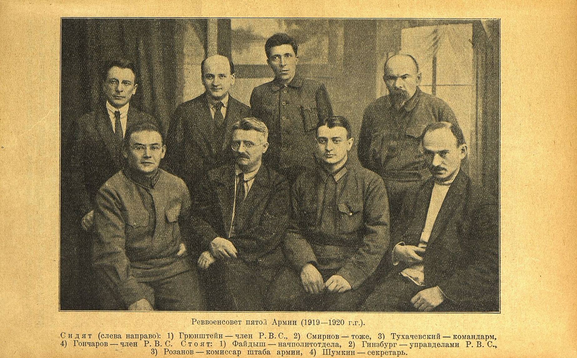 Реввоенсовет Пятой армии 1919-1920 гг. Иван Смирнов (второй слева) сидит рядом с Тухачевским.