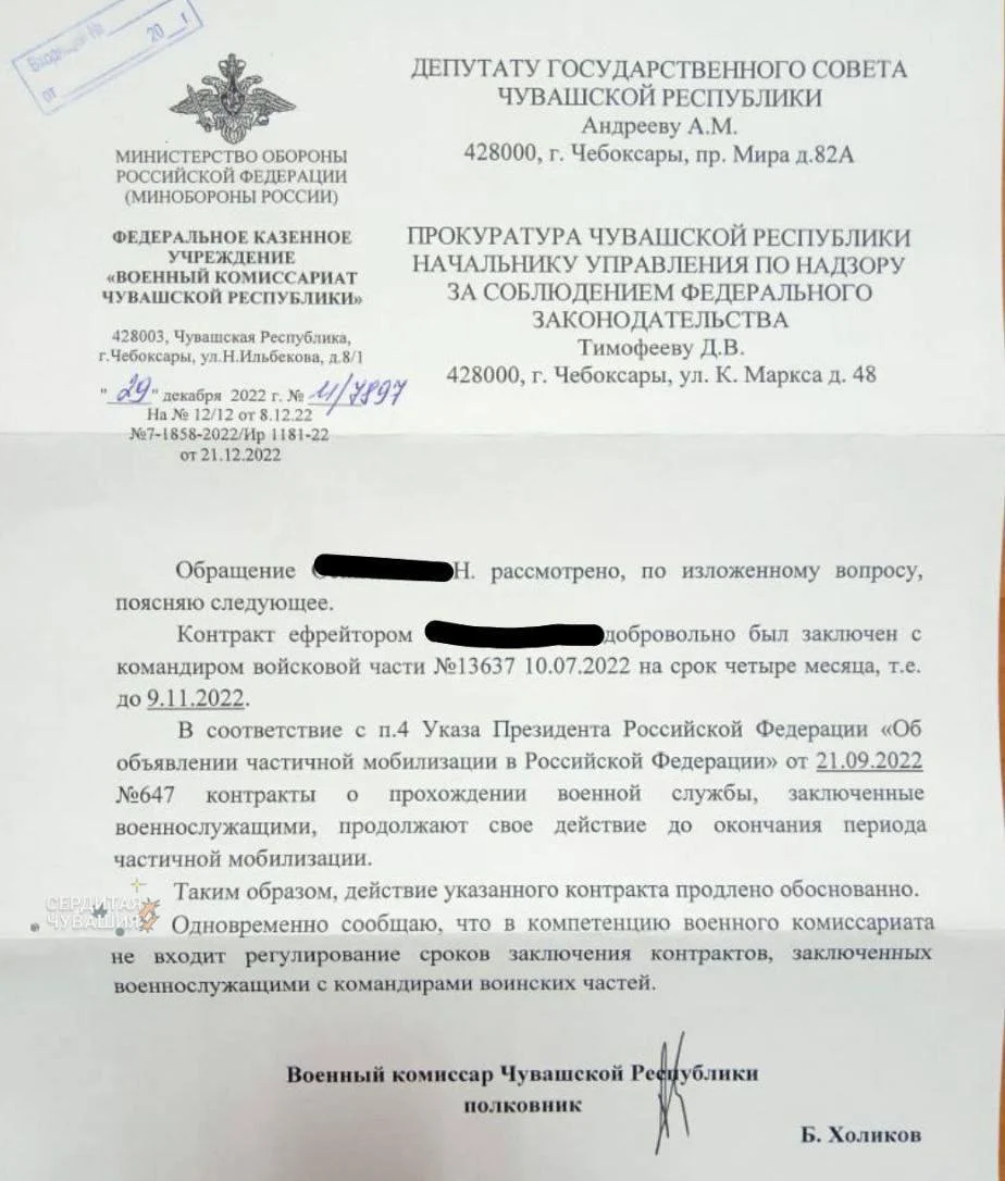 «Контракт ефрейтором <…> добровольно был заключен с командиром войсковой части №13637 10.07.2022 на срок четыре месяца, то есть до 9.11.2022. В соответствии с п. 4 Указа президента Российской Федерации «Об объявлении частичной мобилизации в Российской Федерации» от 21.09.2022 №647,