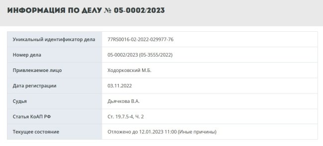 На сайте суда есть карточка дела Ходорковского — ему вменили часть 2 статьи 19.7.5-4 КоАП. Она предполагала штраф до 30 тысяч рублей.