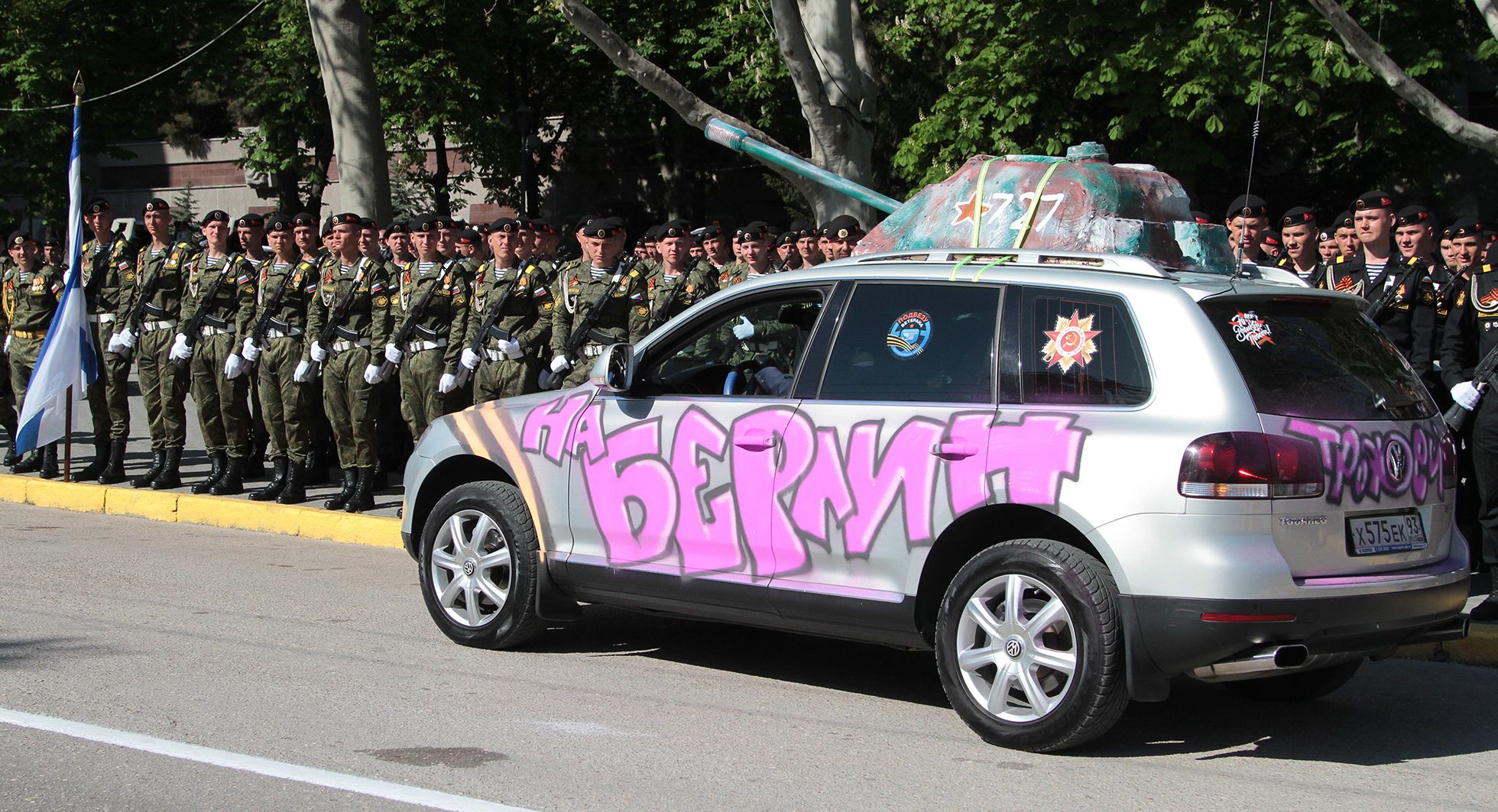 It’s not clear who added the slogan, or when. It’s also not clear that the slogan was an intentional homage to the Reichstag graffiti, which is not even the most famous of the phrases written on the Reichstag walls. (It’s much less well-known than, for example, an inscription that reads “Satisfied with the ruins of Berlin,” which was featured in the celebrated Soviet war drama Only Old Men Are Going to Battle.) What is clear is that it’s been revived and refashioned in the last decade to express a growing resentment about the West’s failure to recognize Russia’s status as a great power, and its “oppression” and “humiliation” of the country. In 2018, journalist Pyotr Akopov called the phrase’s new meaning “a protective reaction to the external pressures Russia is facing.”