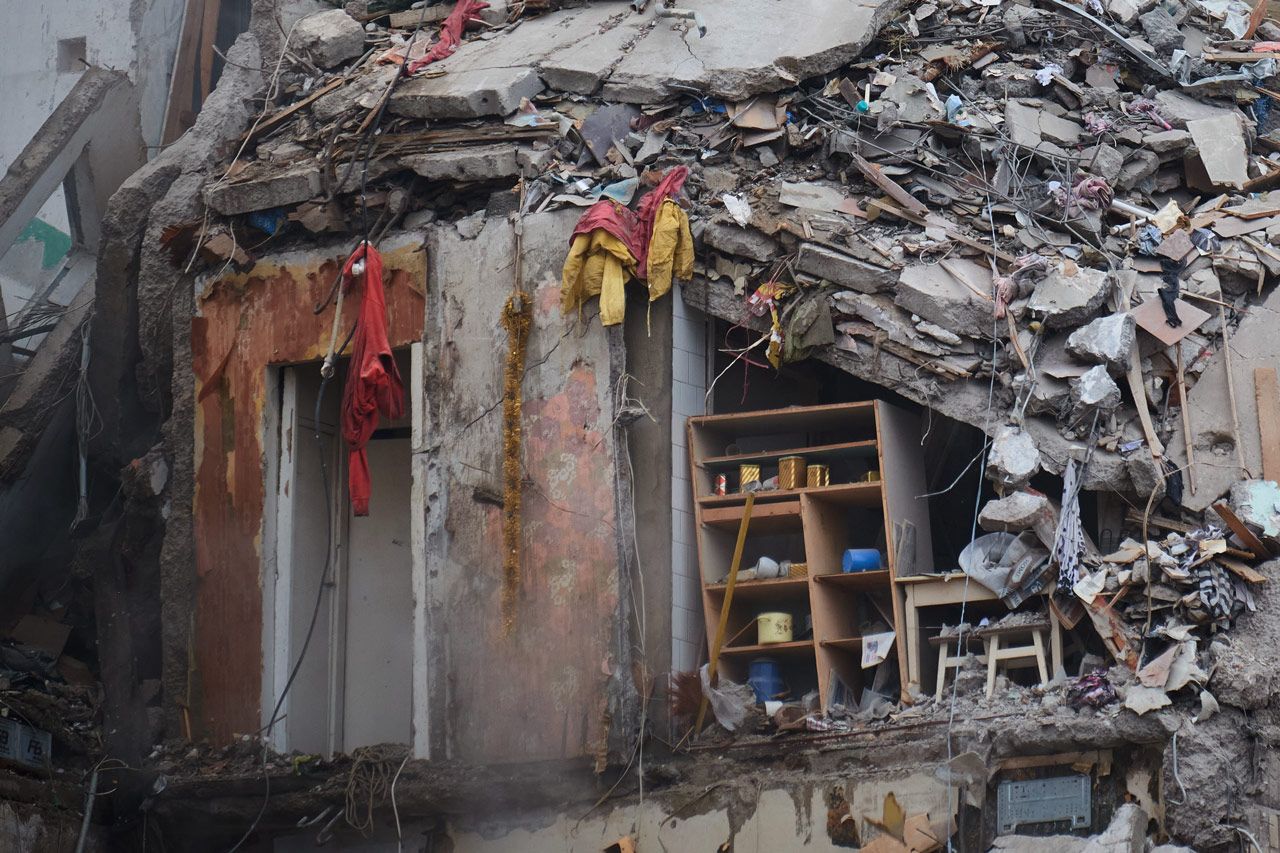 Жители города устроили стихийный мемориал у разрушенного дома, куда несут цветы и игрушки (среди погибших и пострадавших есть дети).