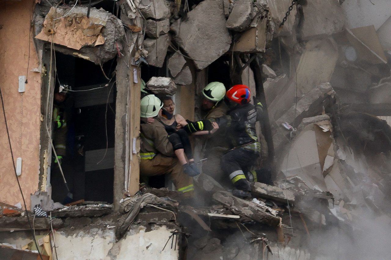 Спасатели в Днепре разбирают завалы после попадания российской ракеты в девятиэтажку