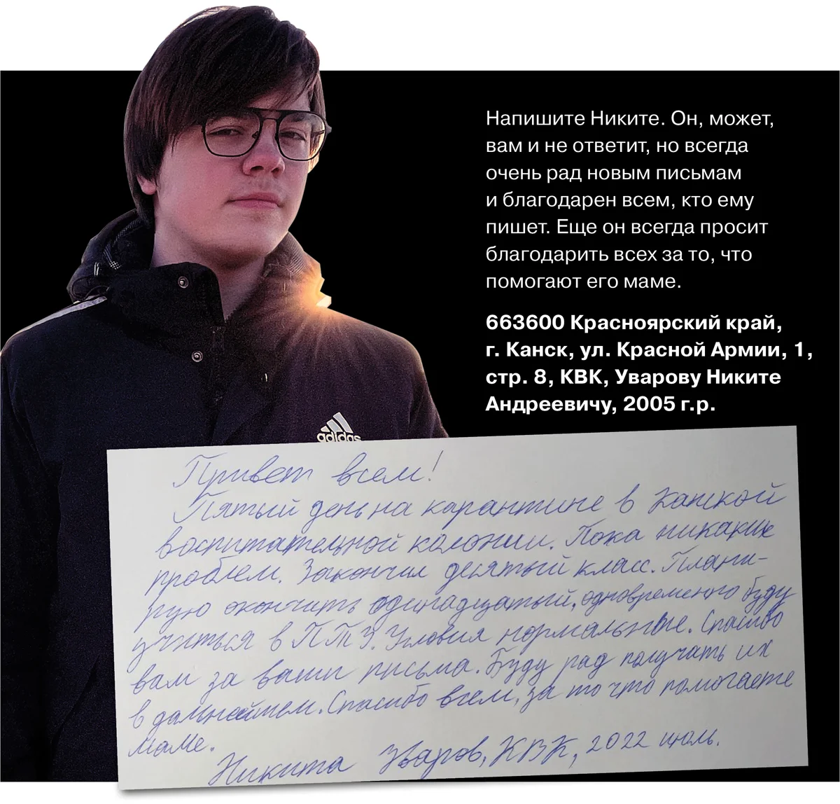 Васин заходит в колонию с пачкой сканов потрясающих писем — в основном, конечно, женских, девичьих. Журналистки, банковские пиарщицы, видеооператор и режиссер, снимавший Никиту. Пишет психолог Николай Щербаков, выступавший на суде, — он по собственной инициативе подключился к делу и анализировал перед судом состояние подростка; пишет ему «Новая» — потому что парень читал ее (и эксперты в его деле ставили ему это в вину). Пишет — многостраничное, уважительное, с запредельным сопереживанием — режиссер Александр Сокуров. Юрий Шевчук отправляет Никите видеописьмо (в 1937-м в Канске расстреляли деда Юрия Юлиановича — Сосфена Ивановича Шевчука. Его имя есть в многотомной Книге памяти Красноярского края).