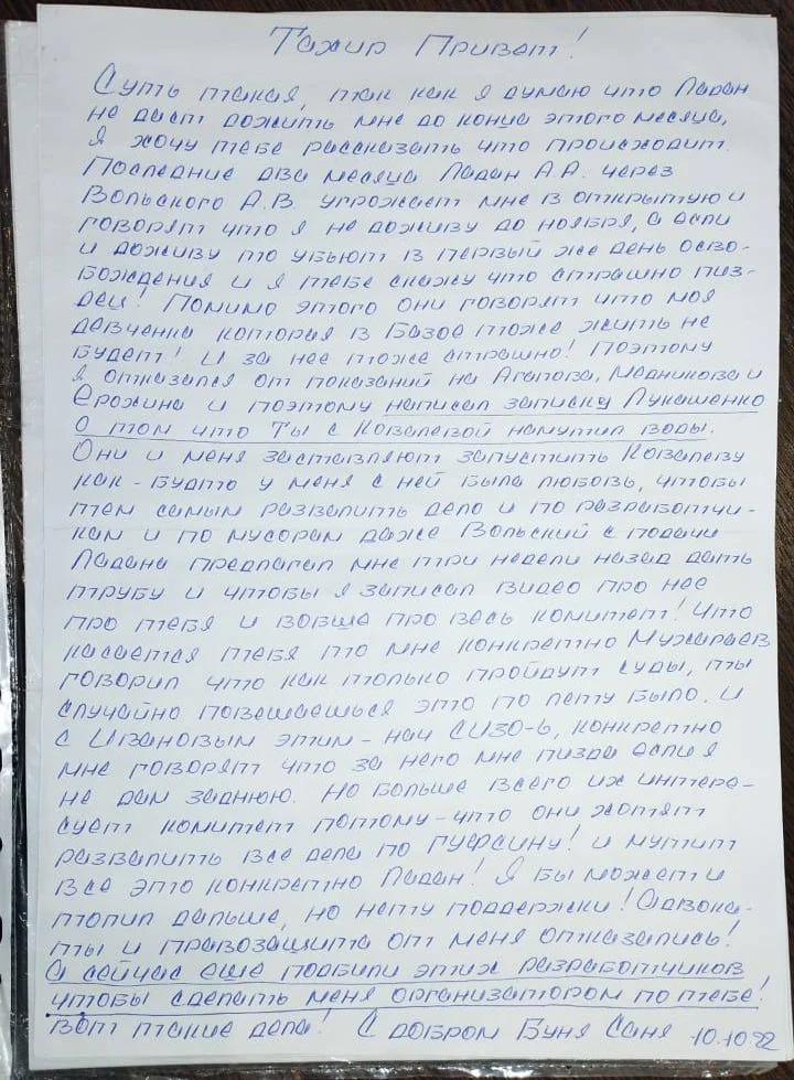 В октябре Бункин, когда все еще находился в СИЗО-1 Иркутска, написал потерпевшему Бакиеву письмо, в котором рассказал об угрозах со стороны первого замначальника управления ФСИН по Иркутской области Александра Ладана. Его слова Бункину передавал сотрудник ФСИН Артем Вольский.